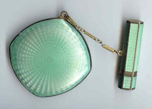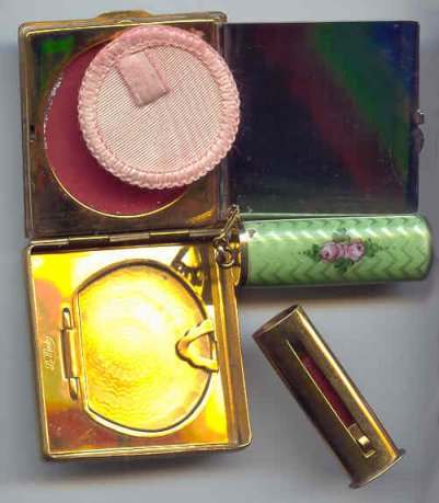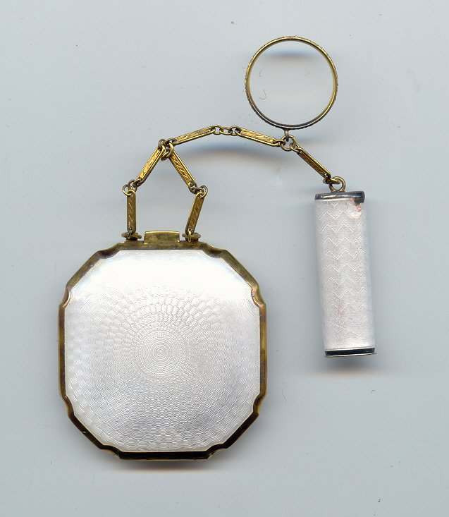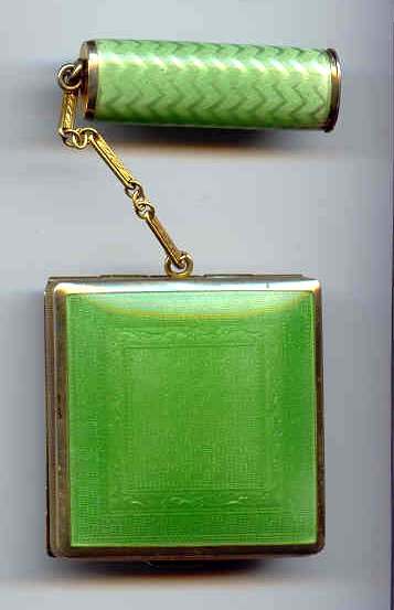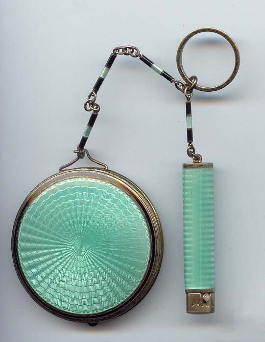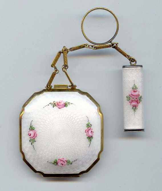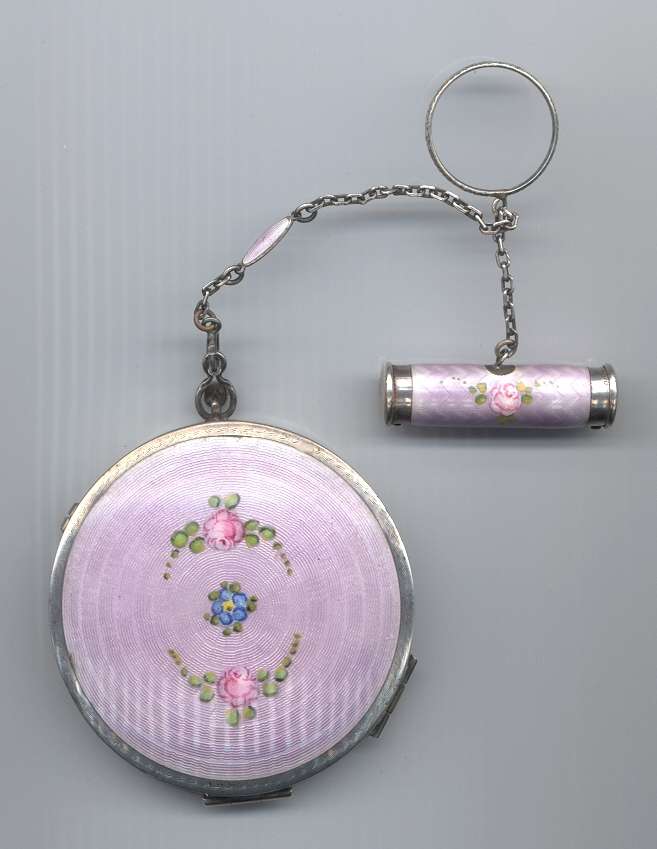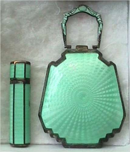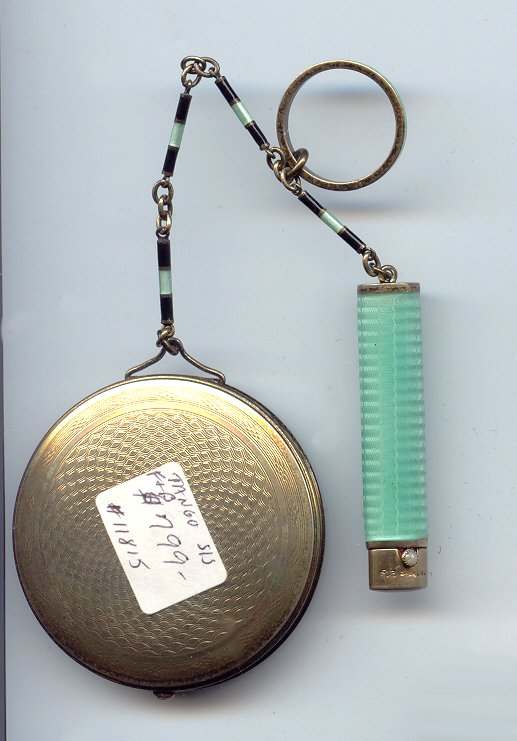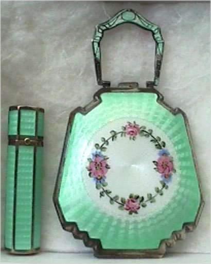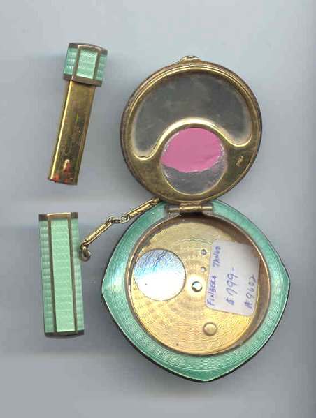 Here is a cream of the crop 2-pc. matched set by FM Co.. Although the case is not marked, I am positive it is sterling silver with exquisite enamel guilloche in mint green on front and back of both cases. Compact has a snow white center with a garland of roses and leaves around the perimeter. The pendant handle is enamel cloisonne. The lipstick case is 6-sided and has gold wash on the interior portion. Compact also has gold wash on the inside. There is a center flip 2-sided mirror, a powder sifter, and a rouge pot with traces of rouge. It is in excellent condition with no damage to either case. There may be some enamel missing on the handle, but even with a magnifying glass, I can't tell if it's just the design or if something is missing. It looks right to me. Compact measures approximately 2" x 2-1/2" and lipstick is 2" long. (Click on pic for more photos.) |