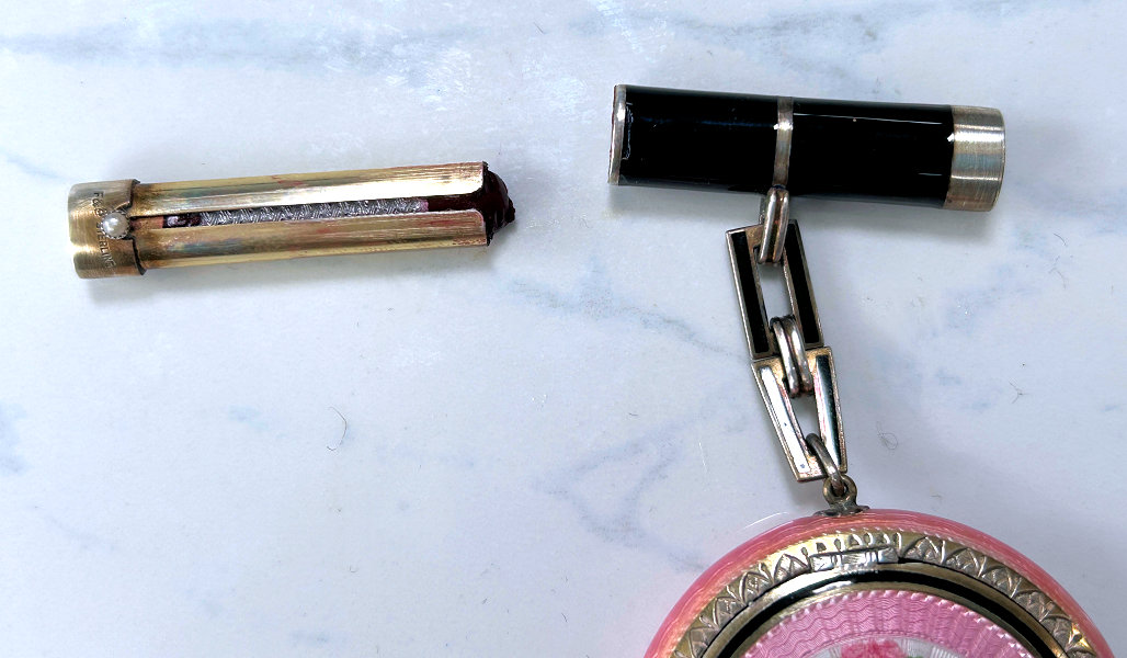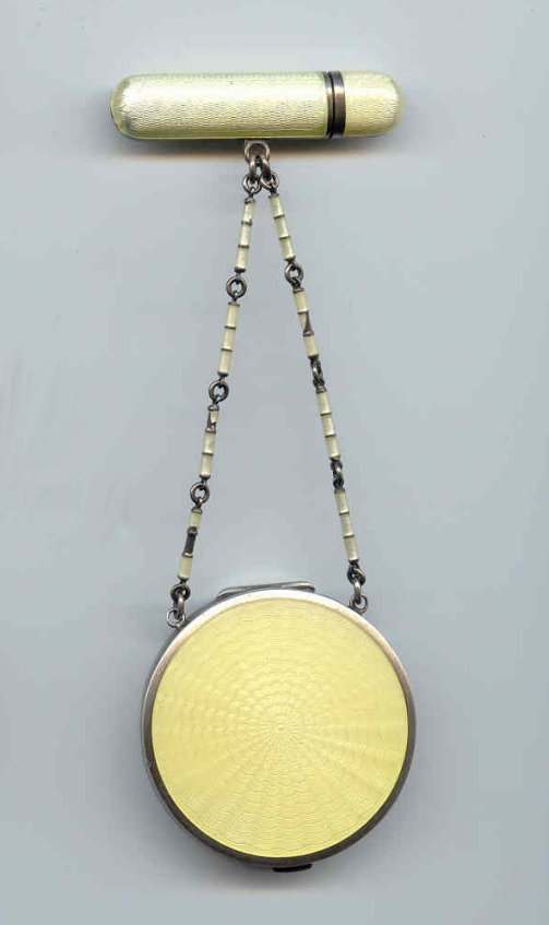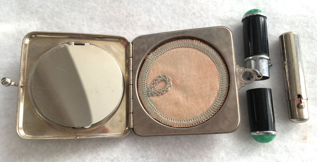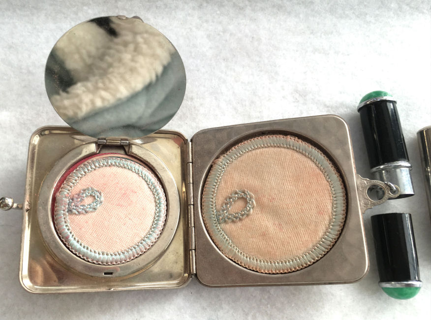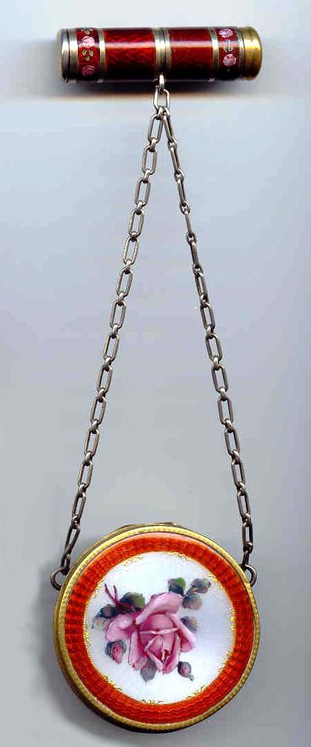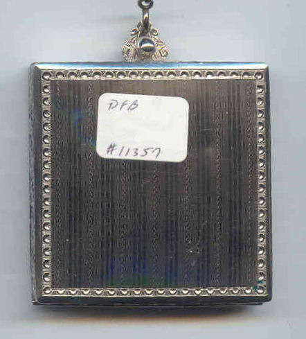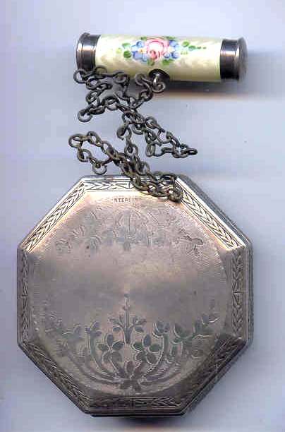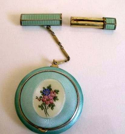 Here is a cream of the crop 2-pc. matched set by FM Co.. Although the case is not marked, I am positive it is sterling silver with exquisite enamel guilloche in mint green on front and back of both cases. Compact has a snow white center with a garland of roses and leaves around the perimeter. The pendant handle is enamel cloisonne. The lipstick case is 6-sided and has gold wash on the interior portion. Compact also has gold wash on the inside. There is a center flip 2-sided mirror, a powder sifter, and a rouge pot with traces of rouge. It is in excellent condition with no damage to either case. There may be some enamel missing on the handle, but even with a magnifying glass, I can't tell if it's just the design or if something is missing. It looks right to me. Compact measures approximately 2" x 2-1/2" and lipstick is 2" long. (Click on pic for more photos.) |