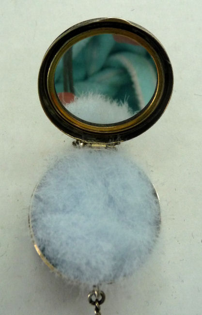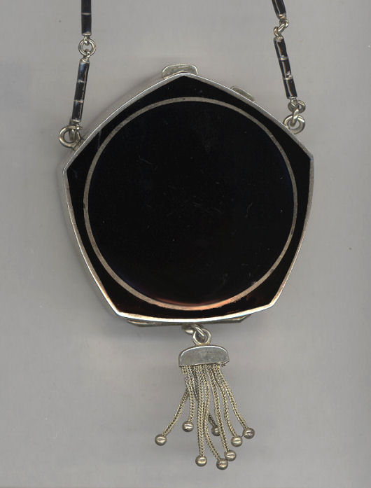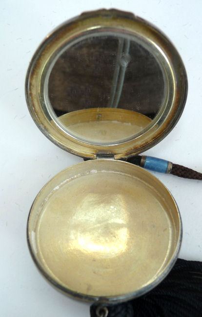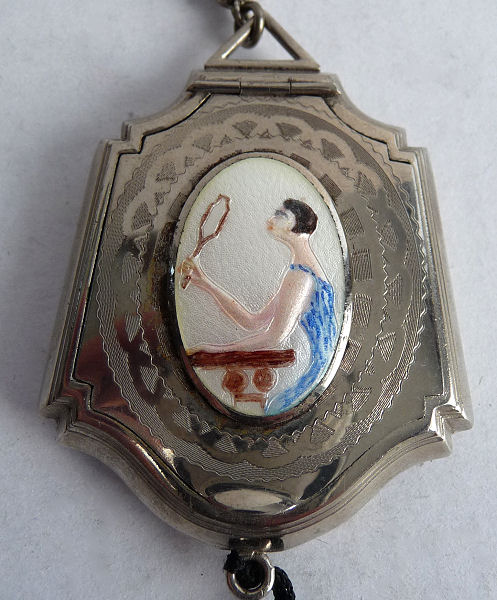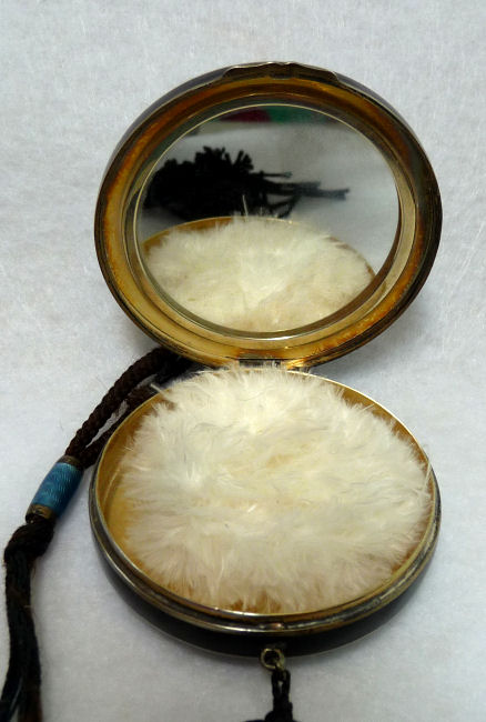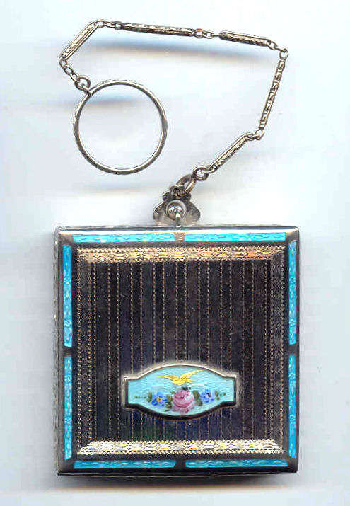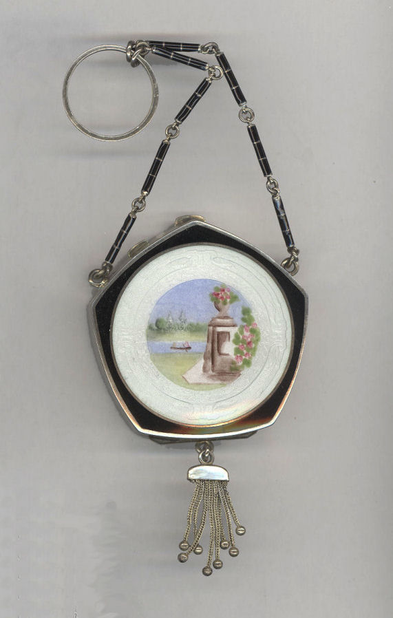 This is a stunning sterling silver compact by the Thomae Co. (hallmarked on inside rim) ... front has a lovely hand-painted scene on enamel guilloche in the center. The back and finger ring as well as the chain are done in solid black enamel. Finished with a little metal tassel with tiny ball fringe ... so cute! Interior has a rouge pot with puff on one side and a powder pat on the other with a double-sided mirror on a center hinge between the two halves. It is in exquisite condition with only minor signs of use, mainly on the finger ring which has a bit of enamel loss. Compact measures approximately 2-1/4" x 2-1/4" not counting handle or tassel. (Click on pic for more photos.) |