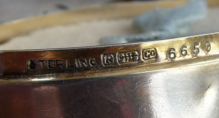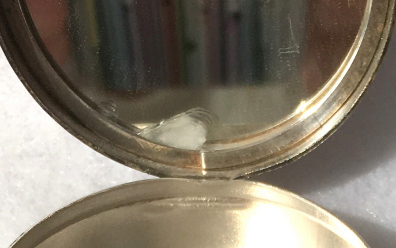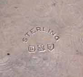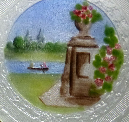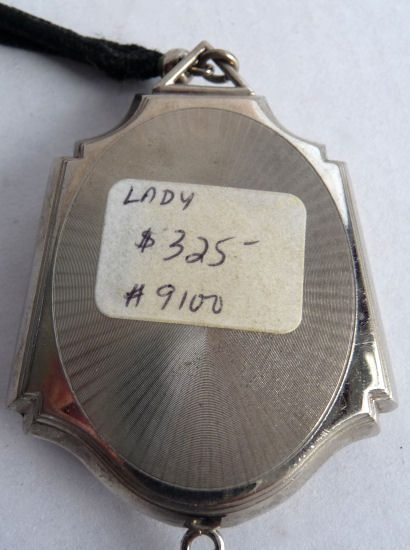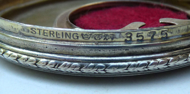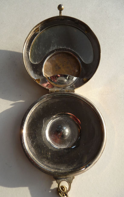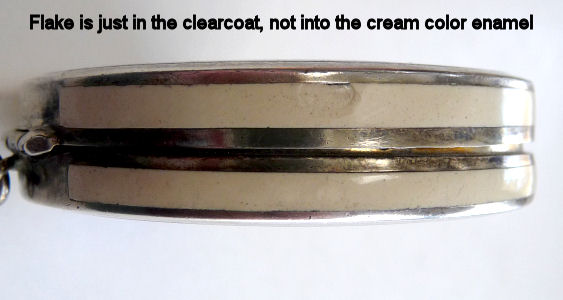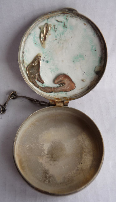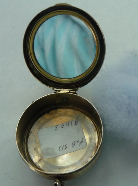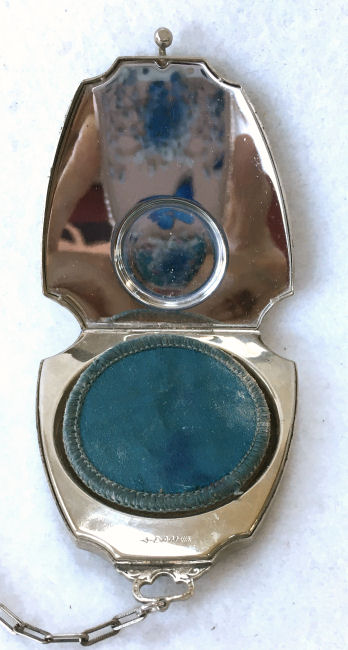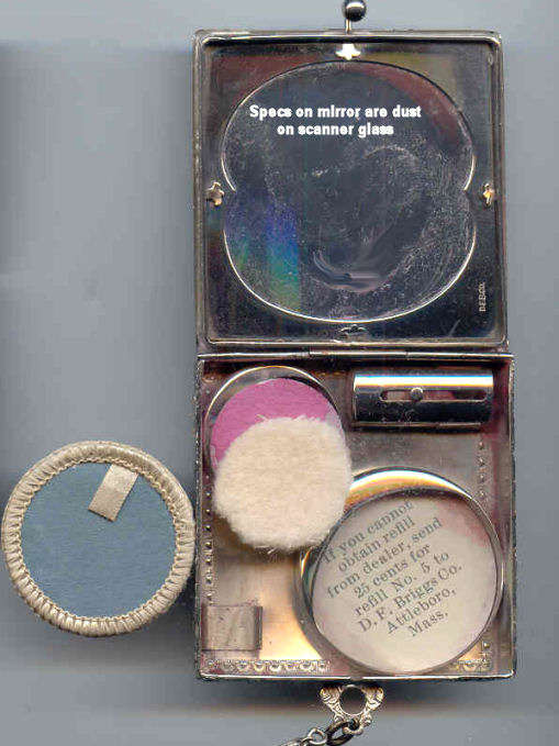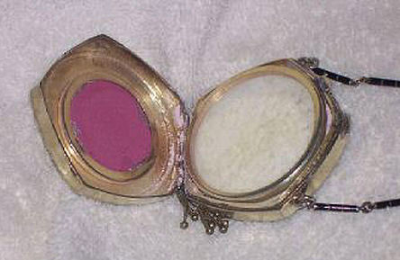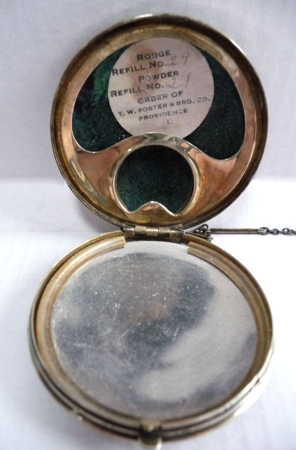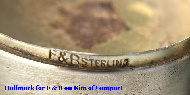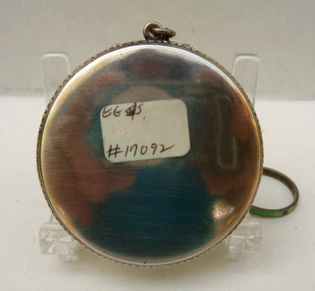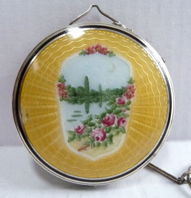 Here we have a compact made by F & B that I have not seen before ... it is a lemon yellow color around the edge with a vignette in the center of a scenic lake with roses blooming in the foreground. You can see the trees reflecting in the water and a pale crescent moon suspended in the sky above. The compact is suspended from a bar and link chain with a finger ring at the top. Both the ring and the compact are signed F & B Sterling. The interior is missing the mirror but this should not be difficult to have made. The original paper label was beneath the powder pat inside, also with the Foster & Bros. name on it. Now as for condition ... the enameling has only a few minor scuffs when held to light but there is a chip in the enamel right at the left edge. Because of this, the price is greatly reduced from what it would be if it were perfect. It is a delightful compact and a rare one to boot! Measures larger than most being 2-1/4" diameter. (Click on pic for more photos.) |
