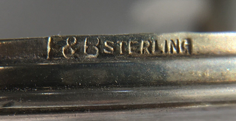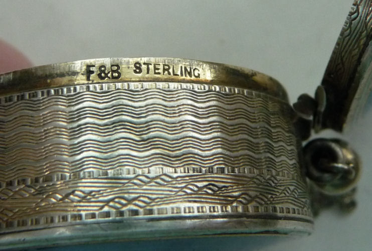 Foster & Bailey (F & B) was known for their extraordinary quality enamel guilloche sterling silver lady's vanity items in the early 1900's. This piece is a superb example of one of their beautiful compacts with an attached chainlink handle with finger ring. The front is a pretty shade of aqua blue in enamel guilloche with a solid black enamel border around the outermost edge. "Guilloche" refers to the designs beneath the enamel which are engraved into the base metal. This compact has radiating concentric circles in waves coming out from the center which, when rotated, look like they are moving around the top. The back of the compact is solid sterling silver with damascened designs. All of the enamel is in excellent condition with no damage whatsoever. Inside the compact, you will find a full mirror in the lid which has some very faint foxing but still totally usable. The bottom half has a retainer ring to hold a powder pat. There is a puff inside which is more than likely original to the piece.The compact is marked F & B Sterling on the rim of the base. This compact has no apologies whatsoever. Measures 2-1/8" diameter. Chain handle has 4" drop. (Click on pic for more photos.) |