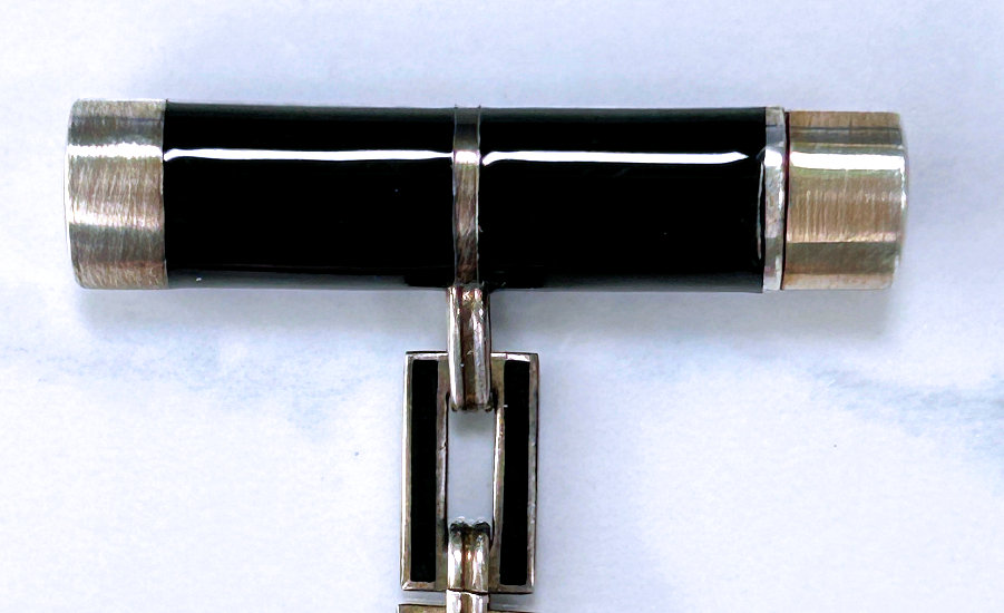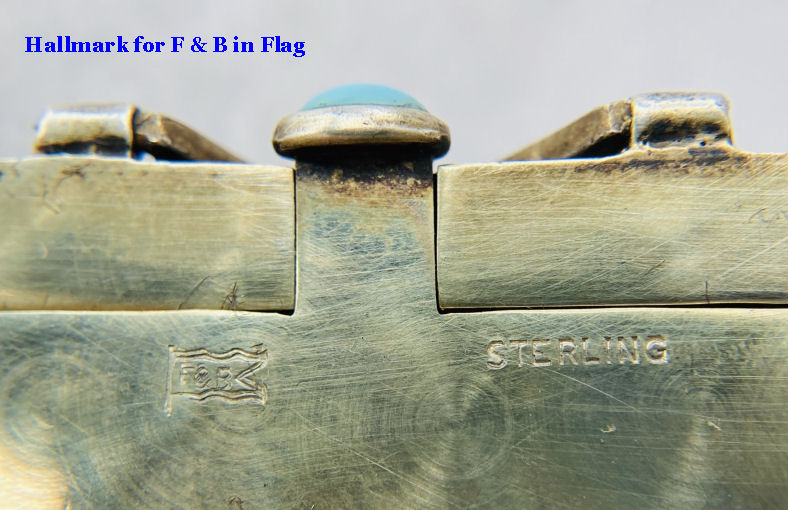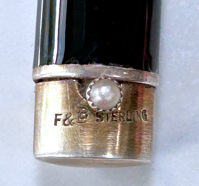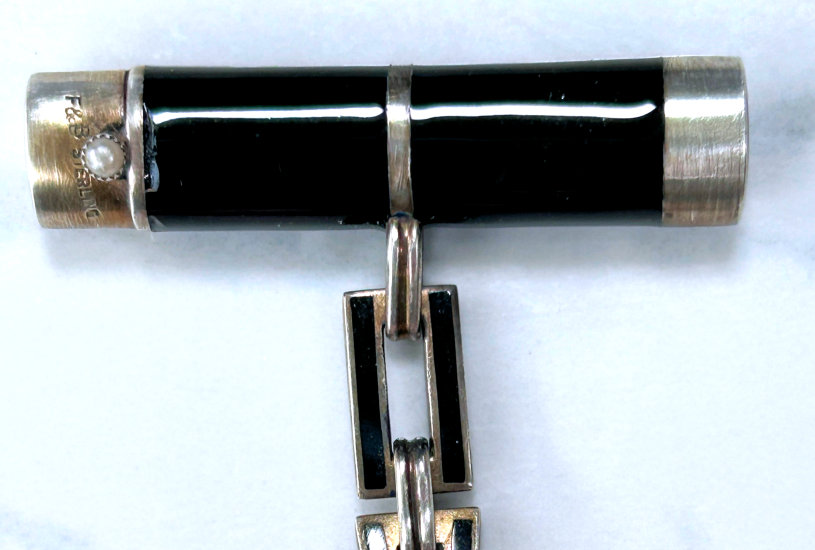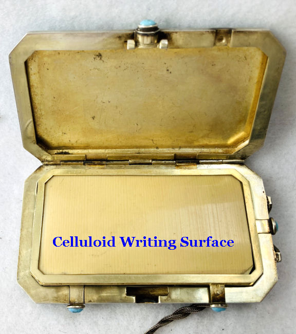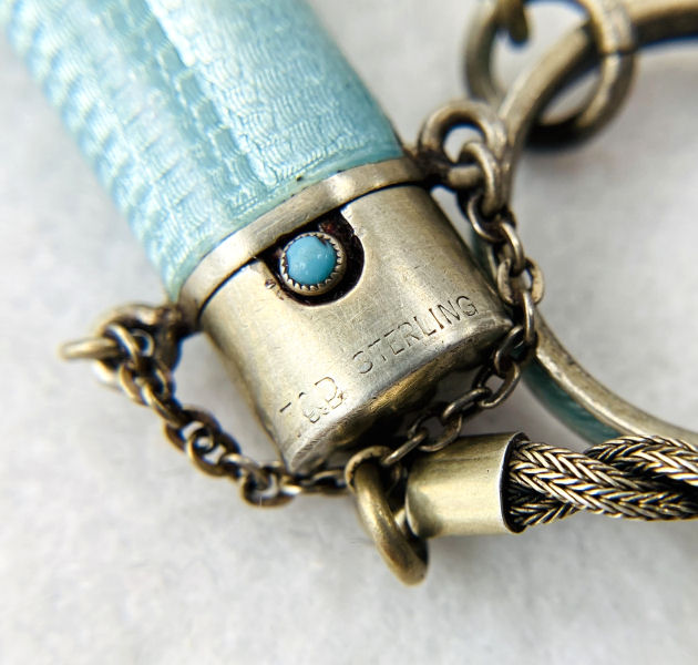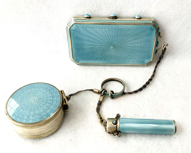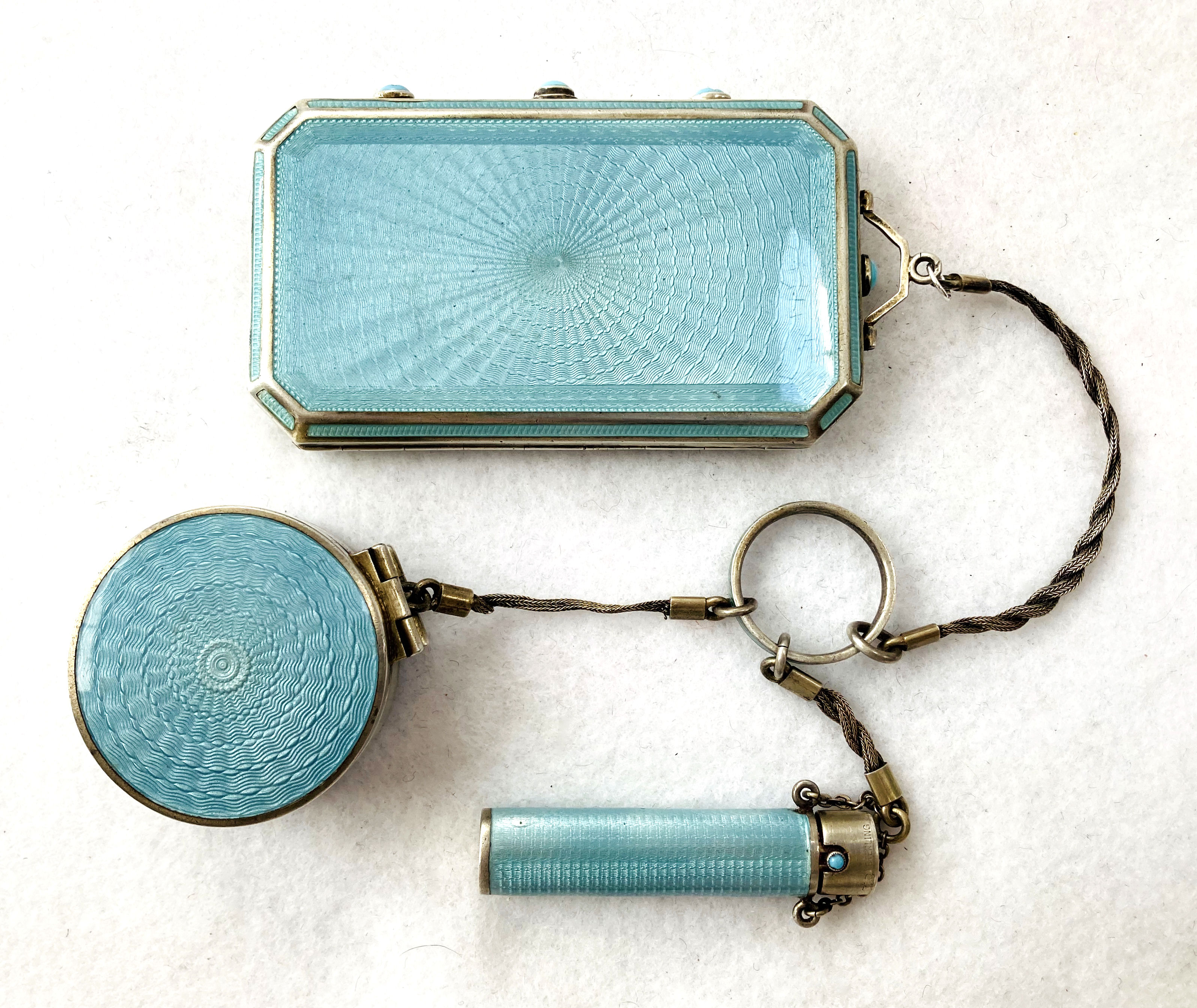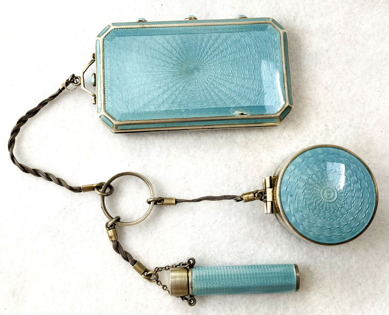 This set has long been a favorite of mine in my personal collection. I have never owned another like it! Made by F & B (Foster & Bailey), this beautiful set includes a vanity case with a celluloid page for writing on, a double-sided compact with two mirrors, and a lipistick. All of these are held together by braided chains suspended from an enamel guilloche matching finger ring. The vanity case and lipstick are adorned with turquoise jewels to give it an added elegance. In its day it would have been one of the premium pieces one could buy. There are several issues I will point out but I gladly accepted these and "forgave" them due to the rarity and beauty of this set. Even with the damages, it displays beautifully. That being said, the vanity case has rub marks in the finish and shows wear on both sides. There is a small chip in the enamel on one edge. The little turquoise jewels have teeny chips on them. There is one half of the braided chain holding the compact missing. Please see all photos. It is really a beautiful set and one you will not easily find again! All pieces are marked F & B Sterling. Vanity case measures approximately 3-1/8" x 2", compact measures 1-1/2" diameter x 3/4" deep, and lipstick is 2" long. (Click on pic for more photos.) |