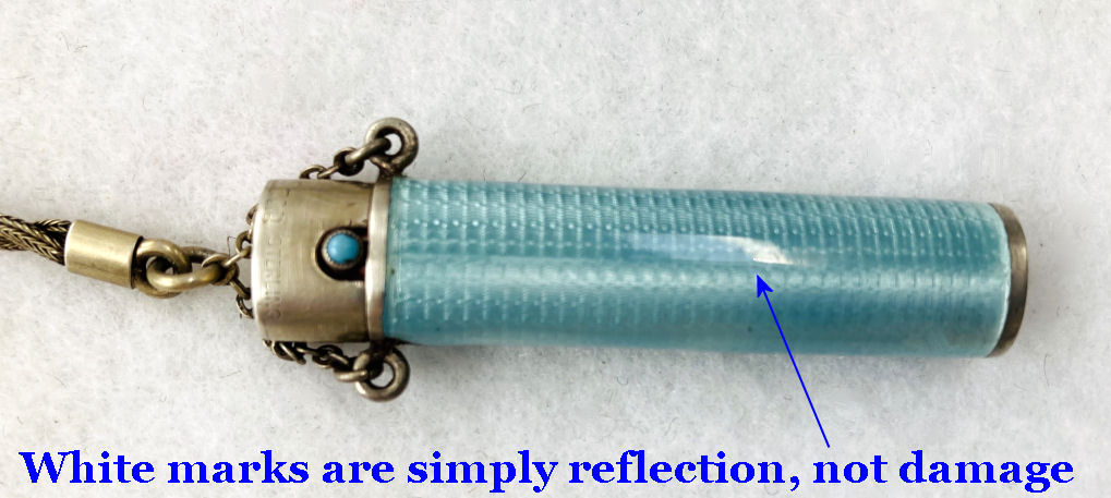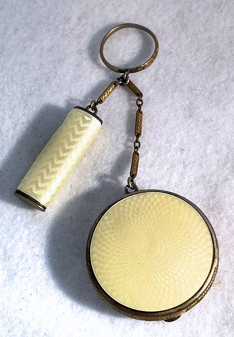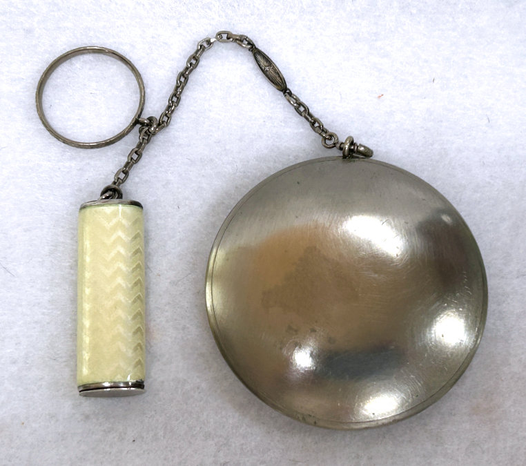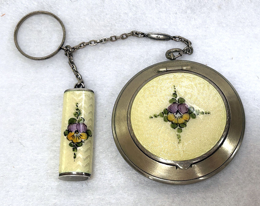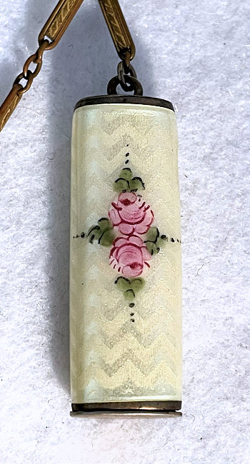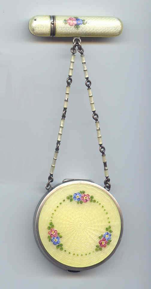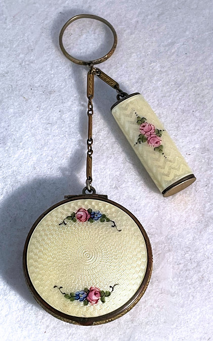 This is a beautiful little sterling silver enamel guilloche done in cream with pink and blue flowers on both compact and lipstick. The sides of the compact are done in black and the back of the compact is solid cream enamel guilloche. Even the little links that hold the compact and lipstick together are enameled. Compact interior features a crescent shaped mirror and rouge pot in lid with open powder well in the base. Enameling on the compact is perfect on the cream sections ... there are some older restorations on the black borders that aren't noticeable unless you are looking for them. The lipstick is near perfect with only one teeny little fleabite out of the tip visible in pic. The chain links do have some damage to the enameling but this is commonly found and doesn't detract too much. All of the above is taken into consideration in pricing ... overall a very nice and displayable tango as well as a usable piece if that is your desire. There are hallmarks on the rim of the case but I am unable to make them out other than the word Sterling. Compact measures 2" diameter and lipstick is 2-1/4" long. (Click on pic for more photos.) |