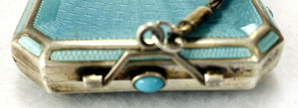 This is such a pretty little vanity case in sterling silver with a robin's egg blue enamel guilloche lid on the compact portion. The little silver tassel is just adorable! Inside the lid is a mirror with some silver loss around the edges. The removable ring handle is not marked sterling that I can find so it may be a later addition although the design is very similar to that on the vanity. Overall it is in excellent condition. Case portion measures 2-1/2" high (not counting little tassel) x 1-3/4" wide. Overall from top ring to bottom of tassel is 7-1/2". It is hallmarked inside but I cannot make out the manufacturer. |