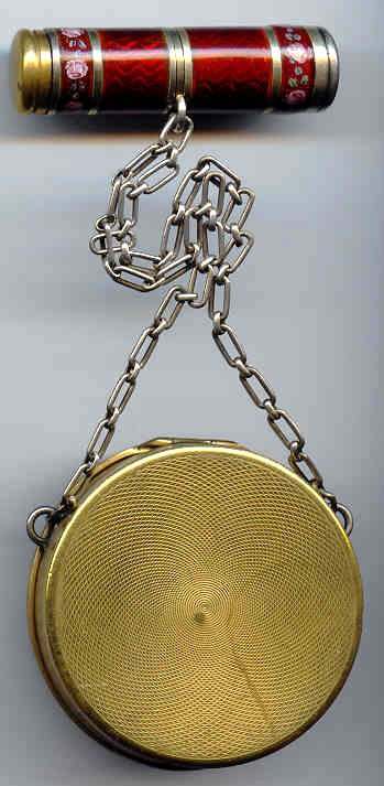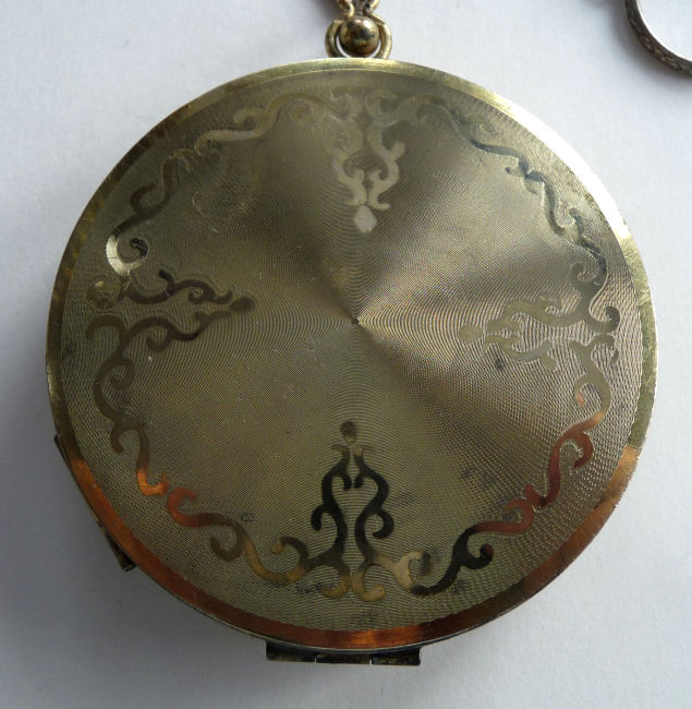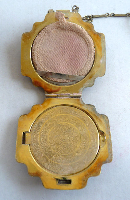This unusual tango compact is done on a gold base metal as opposed to the more commonly seen silver ... and instead of enamel guilloche, it has a border of solid enamel with hand-painted flowers in a garland design. The center of the lid is damascened in a very pretty pattern that resembles a snowflake. The back of the compact has engine turned waves radiating from the center all the way around (there are two very teeny little dents in the back only noticeable when turning in the light ... they did not show up in photo at all). Sides are smooth. The interior of the compact has a crescent mirror and rouge pot holder on one side and a tap-sift style powder dispenser on the other. The chain and finger ring are ornately embossed. The overall condition is excellent with the exception of one tiny chip on the right edge of the enameling ... it is priced accordingly. Measures a bit over 2" diameter. (Click on pic for more photos.) |