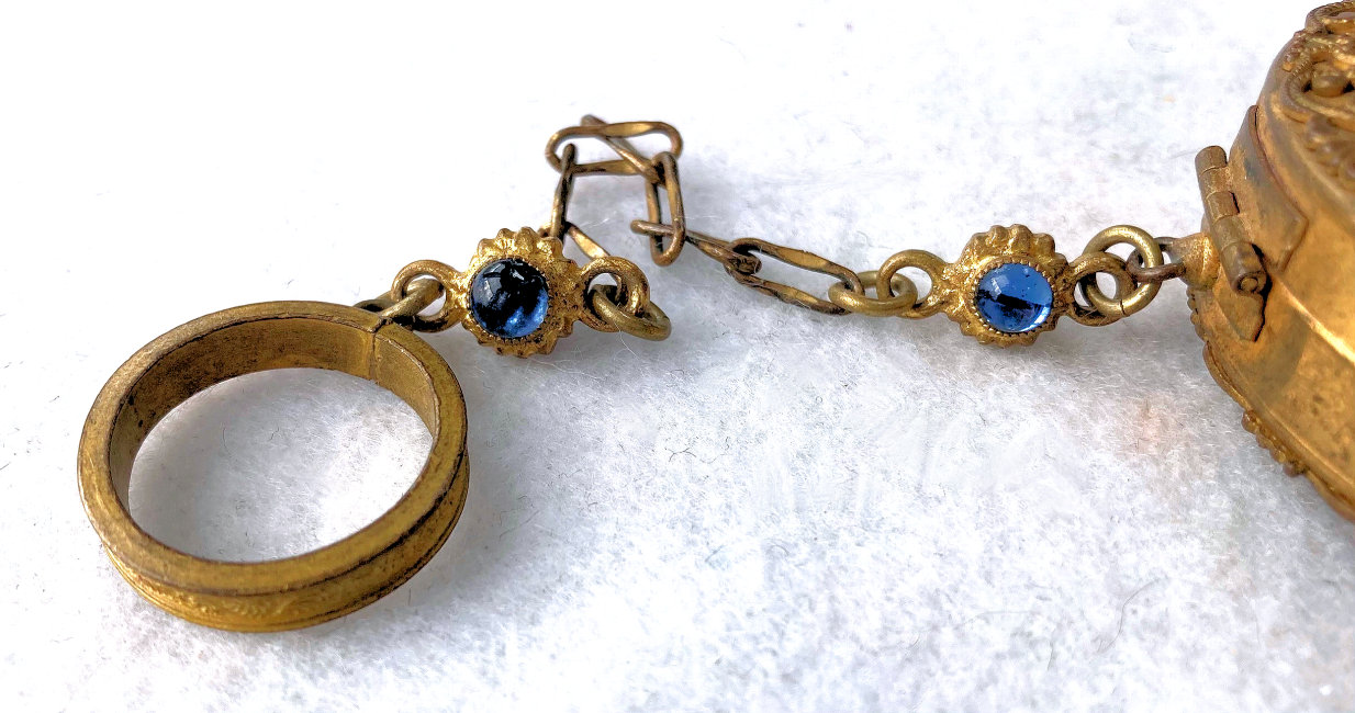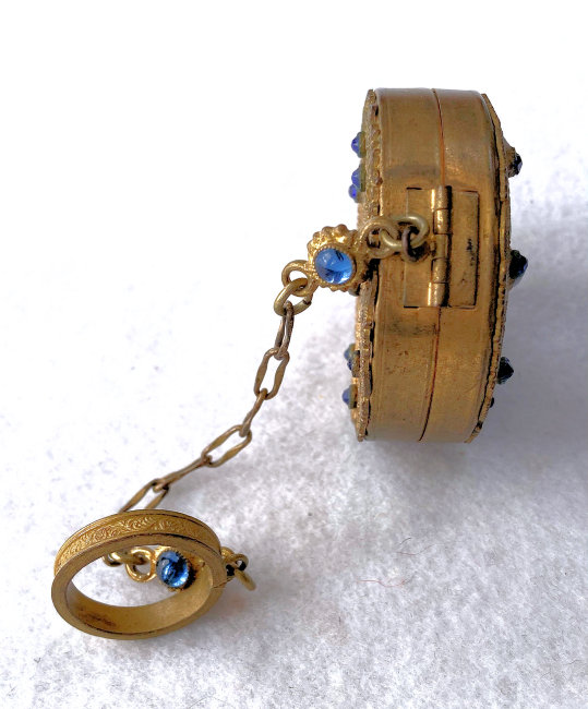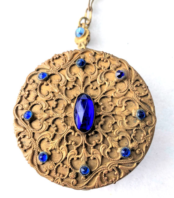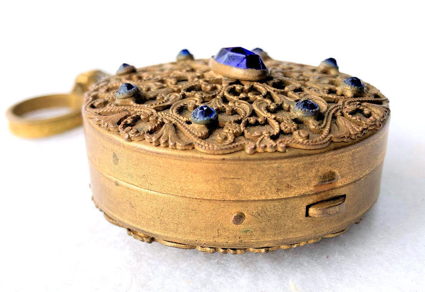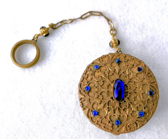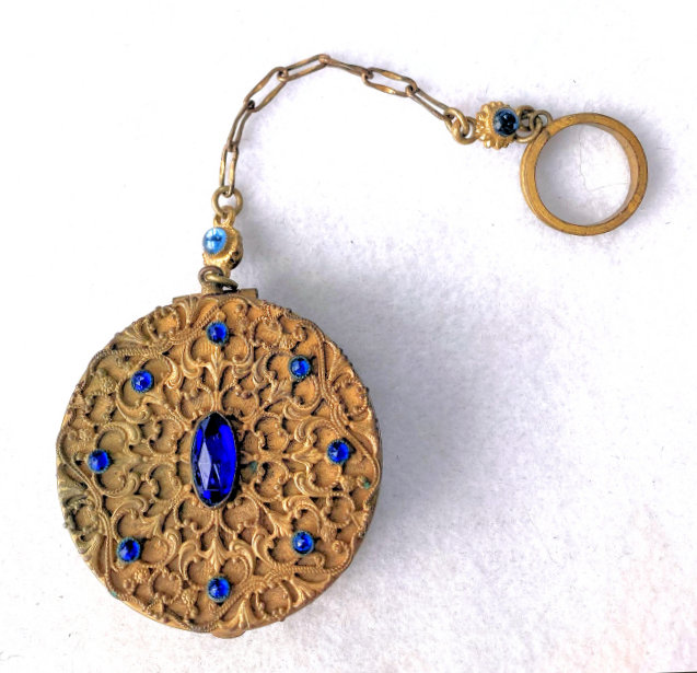 This stunning compact is elegant enough for the finest of occasions! Ornate filigree covers both sides and both sides are also adorned with nine sapphire bezel-set jewels. The chainlink handle has two double-sided jeweled beads with blue gemstones as well. And the finger ring is also ornately embossed. When you open this compact, the center mirror springs open to reveal the powder well below. There is a really pretty vintage "Beauty Puff" which is made of Genuine Washable Lambskin that appears unused. I don't believe it is original to the piece but goes nicely with it, especially since it has a blue label. The compact is not marked anywhere that I can see, but I am almost certain it was made in France as this is a typical French bronze style I have had in the past.. Measures 2" diameter x 3/4" deep. Chain handle with finger ring measures5".. (Click on pic for more photos.) |