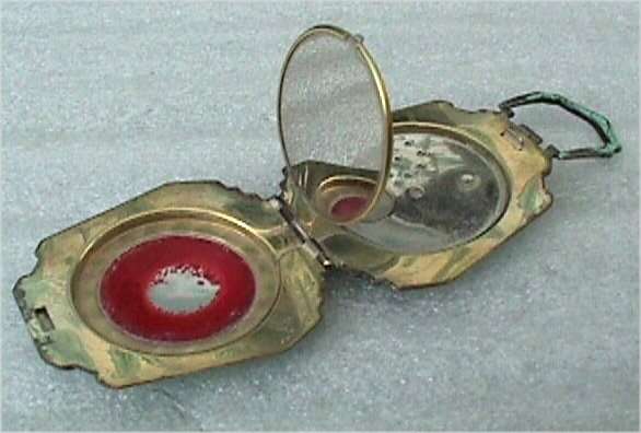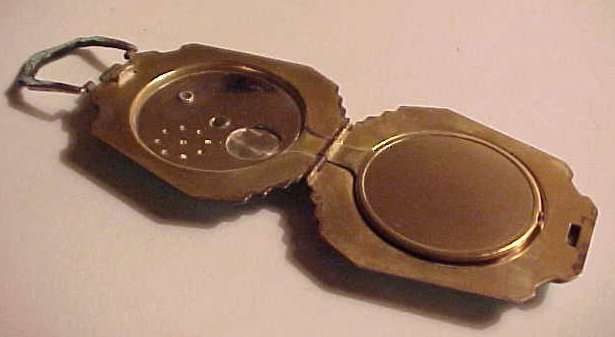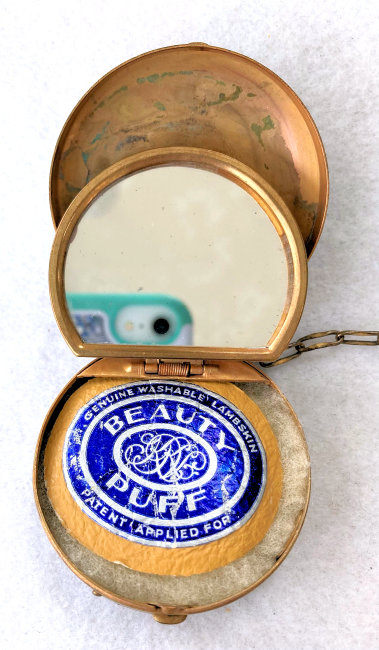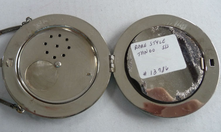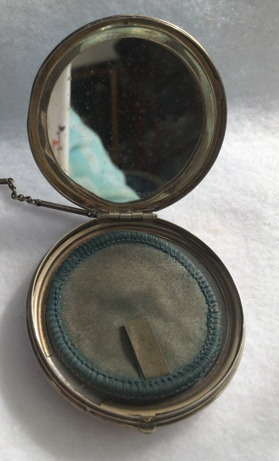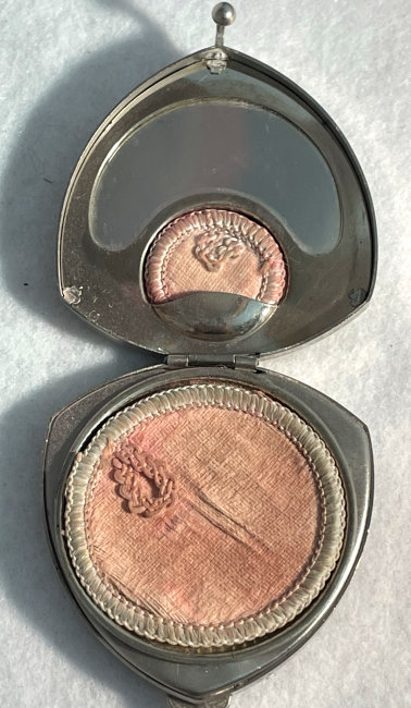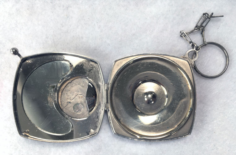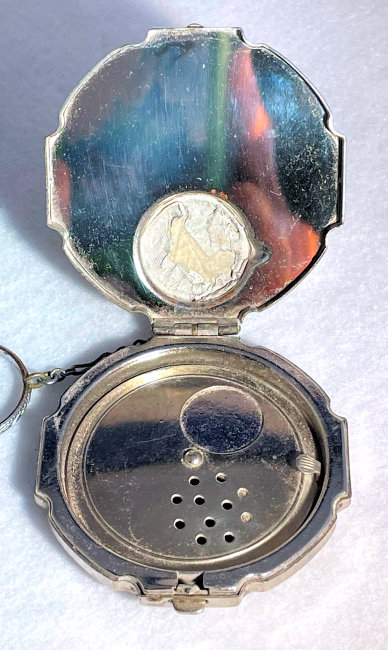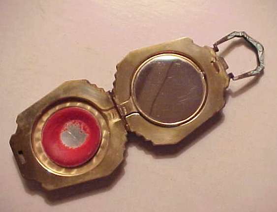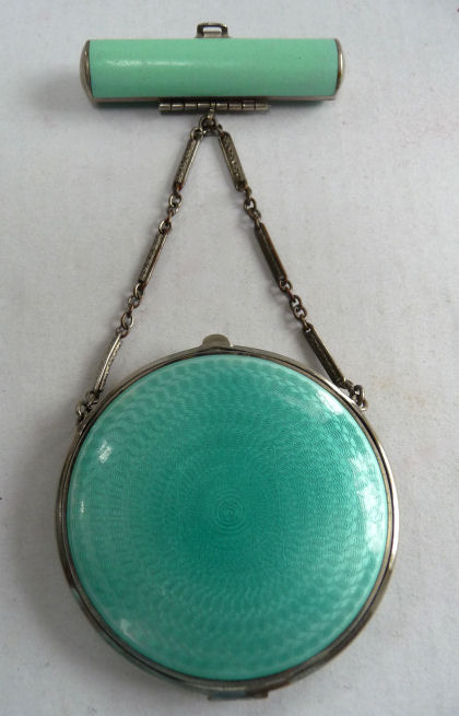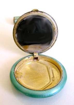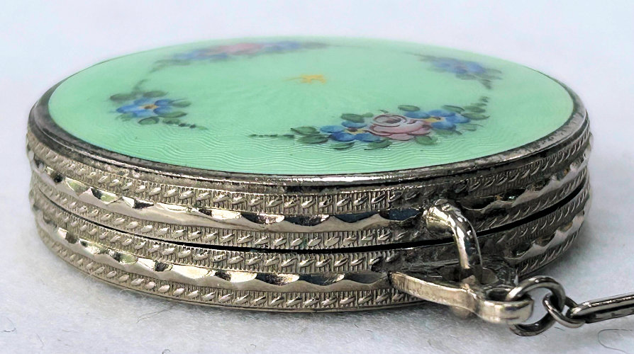 This beautiful tango compact was made by the Thomae Co. of Attleboro, Massachusetts, a company known for their exceptional workmanship. Featuring a full enamel guilloche front as well as a matching chain and finger ring, it also has hand-painted pink and blue flowers in a circle on the front. The color is a lovely mint green shade with radiating guilloche design. The inside of the compact does not have a mirror nor is there any indication that there ever was one. The base has a rouge pot and crescent shaped powder well. There is still rouge and original puff inside and a replacement puff on the powder side. The enameling on the compact is in excellent condition as well as the chain. The little finger ring has an area of discoloration and what appears to be a fracture but feels smooth to the touch so not sure what it is. The compact measures aprpoximately 2" diameter x 1/2" deep. Chain handle is 2-1/2" long and the ring is 7/8" diameter. (Click on pic for more photos.) |