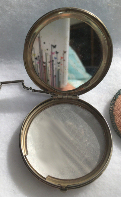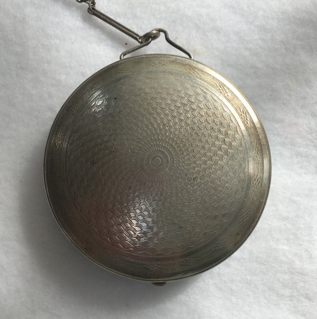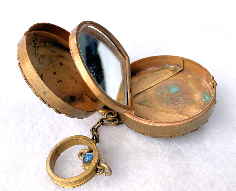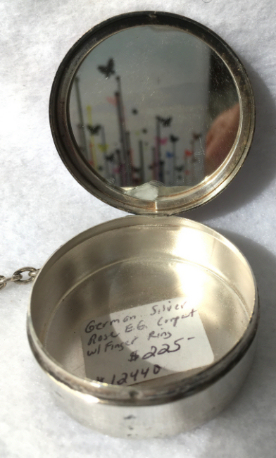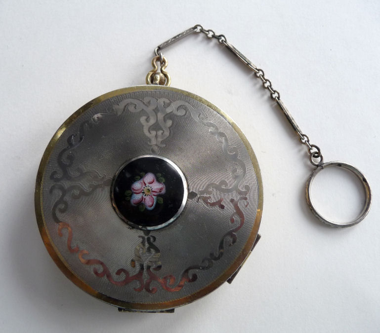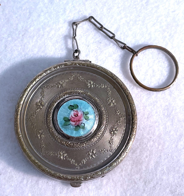 This cute little tango compact made by Evans has beautiful embossed flowers on the lid and damascened design on the back of the case. The front of the case has a center vignette in robins egg blue enamel guilloche with a little hand-painted pink rose. The finger ring is large enough to wear on your middle finger. Inside you will find a more-than-half size mirror in the lid with a tiny rouge pot beneath. The bottom half of the case has a rotating powder sifter with damascened designs in the metal. Measures 2-1/8 diameter. The chain and finger ring are 3" long total. (Click on pic for more photos.) |
