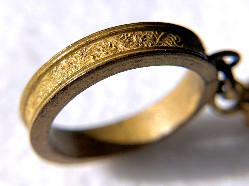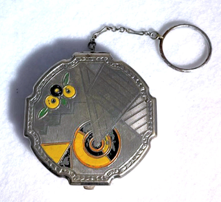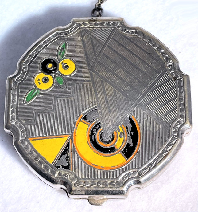 This cute little Art Deco design tango compact has beautiful damascened designs on the front and back of the case. The front of the case has yellow, black and green painted accents on it (unfortunately does have a bit of paint loss as is common with this type of paint). The finger ring is large enough to wear on your middle finger. Inside you will find an almost full round polished metallic mirror in the top with a well for a rouge pot built in. The bottom half of the case has a rotating powder sifter and a little tab to hold a powder puff. With the exception of the paint loss on the front, the rest of the compact is in very good condition. Measures 2-1/8 diameter. The chain and finger ring are 2-5/8" long total. (Click on pic for more photos.) |