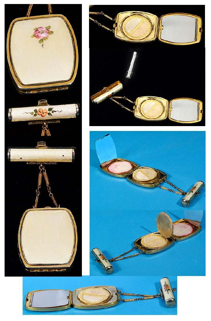 Here is a rarely found all-snow white enamel guilloche tango compact with pink roses mounted in a gold frame. Even the finger ring chain is gold! Marked "LaMode" on the inside. Compact is in perfect condition ... lipstick has one tiny area of enamel loss on top back. Interior has a rotating powder well in the lid and a covered rouge pot in the base with two puffs that appear to be original. Compact measures 2" square and lipstick is 1-1/2" long. (Click on pic for more photos.) |