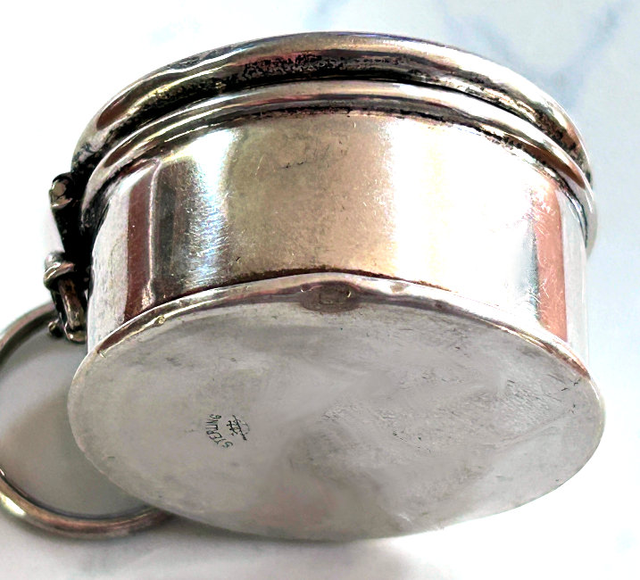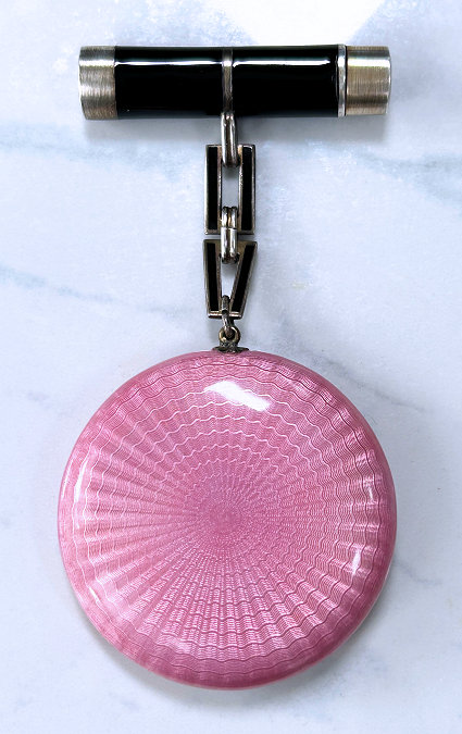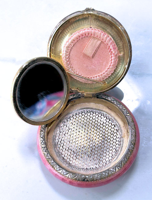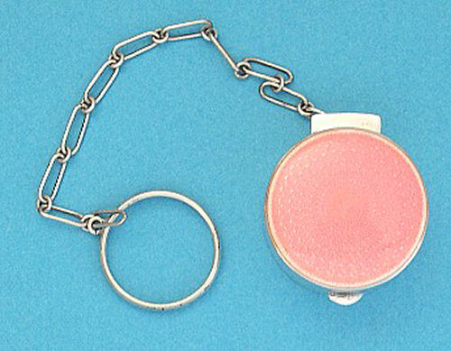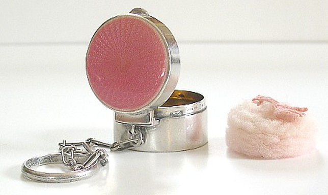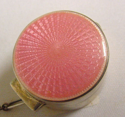 This is a darling little compact with finger ring in sterling silver with a pretty candy pink enamel guilloche lid. The interior is fitted with a mirror in the lid and a cute original lambswool puff with pink ribbon on top. Hallmarks on rim but I do not know who made it. It measures only 1" diameter x 5/8" deep and is in excellent condition. (Click on pic for more photos.) |