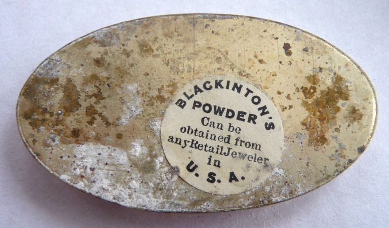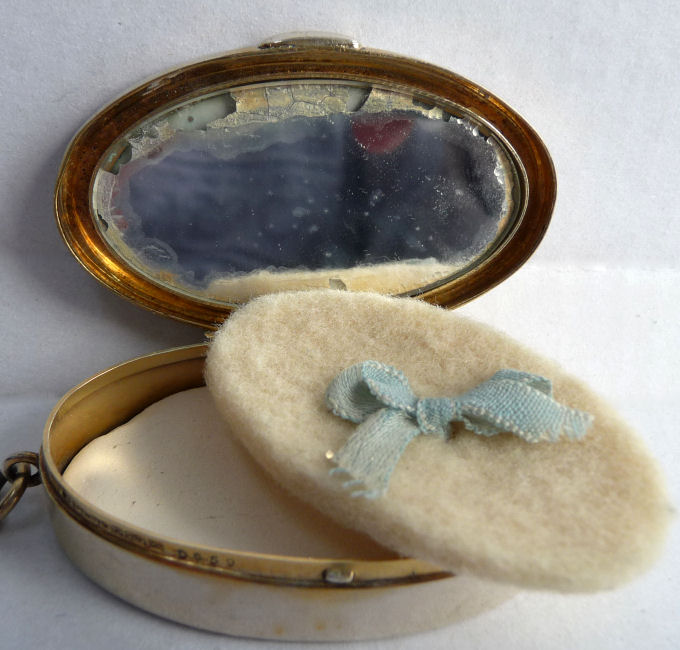 This is a sweet little compact on a finger ring chain made by R. Blackinton.It is oval in shape and has a beautiful center vignette of pink roses in full bloom on an ivory background. Surrounding this is a border of beautiful baby blue enamel guilloche. When the compact is opened, it has a set-in mirror in the lid which shows considerable silver loss around the edges; however, this is not a beveled mirror so it could be easily replaced. In the base is an original puff with a sweet blue bow on it and beneath it a removable powder pat, original to the piece as it is marked Blackinton on the bottom (see pics). It is in excellent condition! Measures 2-1/4" long x 1-1/4" wide x 1/2" deep. (Click on pic for more photos.) |