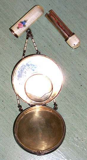 This is one of my very favorite tangos ... made by Ripley & Gowen, it is done in sterling silver with a lovely ivory background. Hand-painted on this is a lovely Victorian basket overflowing with pink roses and adorned with a pretty lavender bowl. The matching lipstick / eye brow pencil has tiny roses on it. Each end is marked with the contents: lipstick on one end and eye brow on the other. Interior of compact is missing it's mirror in the lid but I'm sure this could be easily added. Base has retainer to hold a powder pat. Signed R & G and Sterling. Enameling is all excellent. Chain is very long and seems to me to be a replacement. This could be easily changed if one desired; I left it as found since it was not objectionable to me. Back of case is beautifully engine turned in Victorian design. I just noticed when looking closely at the eye brow section that the little button that locks it into place is missing ... however, it fits tightly and is not a problem but i wanted to mention for accuracy. Compact measures 2-3/8" diameter and lipstick is 1-5/8" long. (Click on pic for more photos.) |
