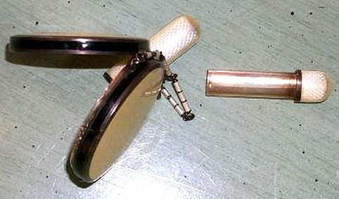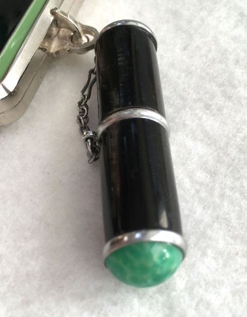 Here we have a delightful little French Ivory (celluloid) tango vanity case with original matching case for lipstick. The lid is inset with 29 turquoise blue stones, and there are black beads around the exterior. The original tassle and handle have Chinese knot decorations. Interior features a mirror in the lid and powder pot in bottom with original Cara puff. It is in excellent condition! Measures 2-1/2" diameter x 14-1/2" long from lipstick case to bottom of tassle. (Click on pic for more photos.) |