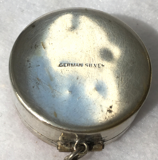 This is a very sweet little compact made of German Silver in a pale coral pink enamel guilloche. The lid is completely covered in three separate sections with three different guilloche designs ... very pretty! The compact has a mirror inside the lid and an original wool puff with ruched silk backing. There is also a chain with finger ring to carry it by or attach to a chatelaine. The mirror itself is very clear and has no foxing or discoloration; however, there is a wee chip at the very bottom. It does not interfere with reflection as it is right at the edge. The enameling is also in great condition with one very tiny chip in the center ring near the top (how it got there, I wouldn't have a clue but it is possible it was a factory miss as it doesn't look quite like a chip under a loupe but rather a glaze miss). In any event, I am pricing it according to the condition. It is marked German Silver on the base. Measures 1-1/2" diameter x 3/4" deep. Chain handle has 4-1/2" drop from top of ring. (Click on pic for more photos.) |