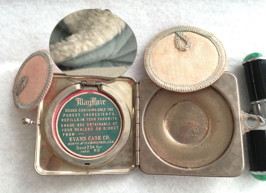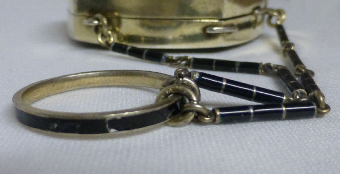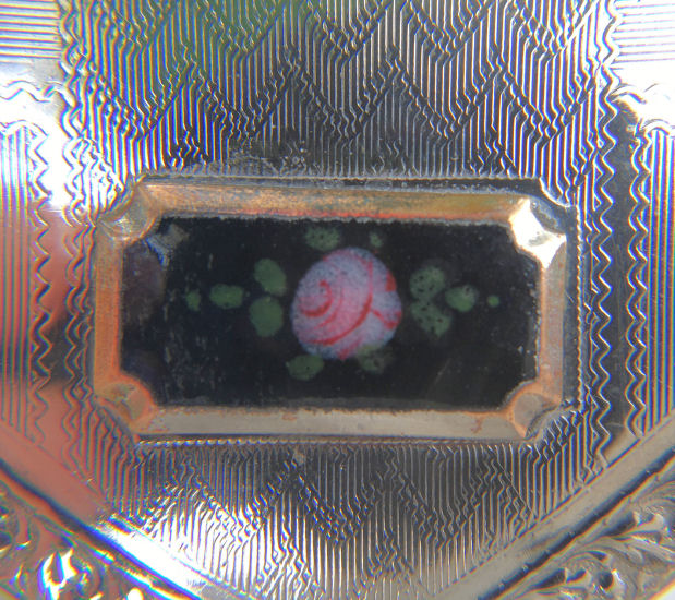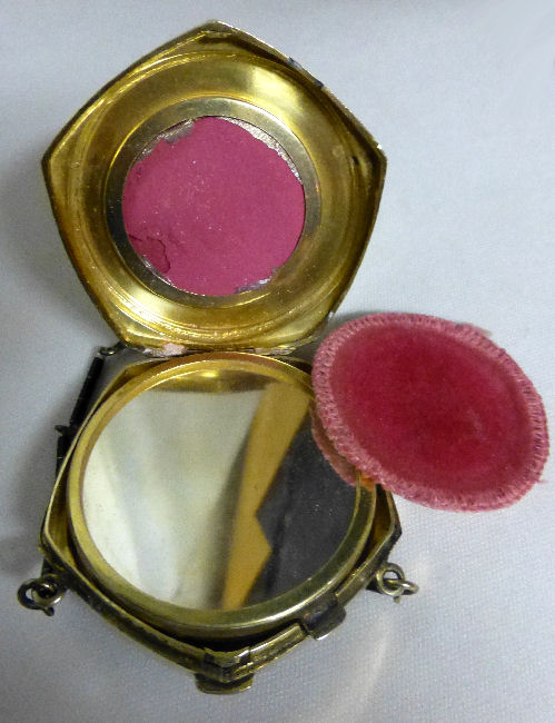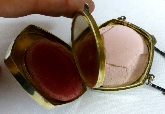 Although it is unmarked, this very pretty little tango compact is attributed to Evans du to the Tap-Sift powder dispenser inside. The case on this one is truly gorgeous with damascene flowers, leaves, stripes and other designs on the front and engine-turned designs on the back. The front of the case has a small vignette with a hand-painted pink rose and leaves on a black background which is the perfect accent for this dainty piece. Inside you will find a crescent shaped mirror on one side with a rouge pot beneath and the tap-sift powder dispenser on the other. There is a bit of foxing on the bottommost part of the mirror but it is otherwise totally clear and usable. Overall it is in excellent condition. Worth mentioning: the rose vignette is slightly askew and it appears to be made this way. It could probably be removed and reattached but I do not want to do that. This is the way I bought it and I prefer to leave it as is ... I have owned this since 1999 and it has never bothered me at all. In fact, I never really even noticed it until I took the close-up photos for this page :-). Measures 2-1/2" x 2-1/2" at the corners. The chain and finger ring are 4" long total. (Click on pic for more photos.) |