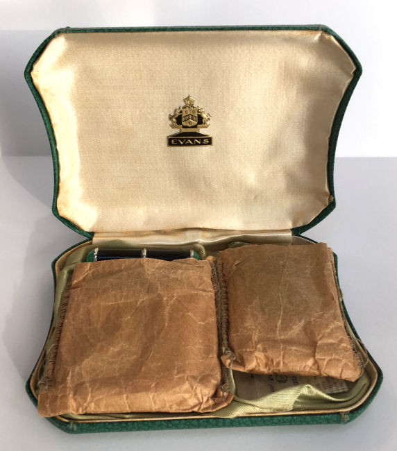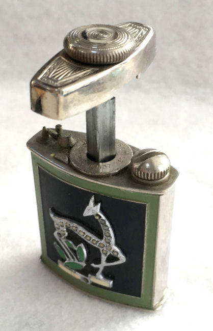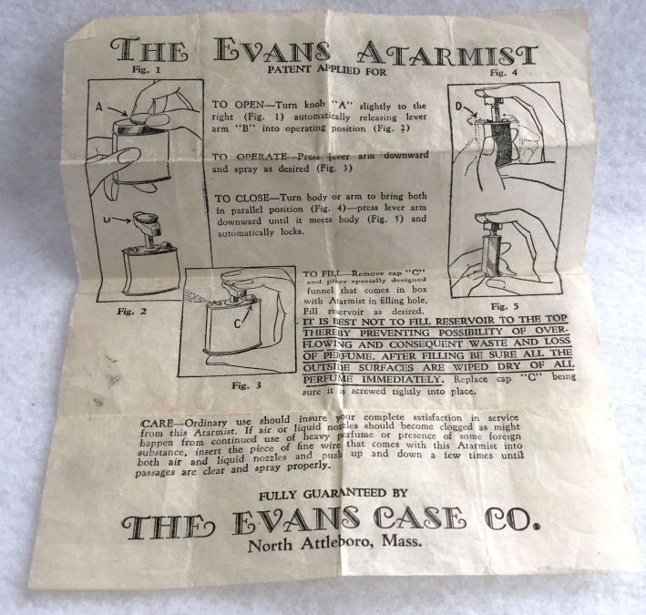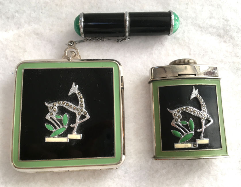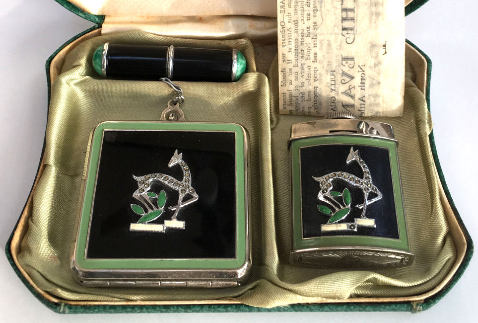 This gorgeous set has been a prize in my personal collection for many years (since 2007) and has never been offered for sale before. I hardly know where to begin to describe it ... so let's start with the original presentation box by Evans, lined in green silk with label inside lid, the original felt-lined sleeves to protect both pieces, and the original instructions for filling and operating the Atarmist perfume. Now for the pieces: Both pieces feature lovely art deco gazelles inlaid with marcasites and surrounded in black, green and ivory enamel. The back of both pieces have a very pretty embossed design. The tango compact has an attached lipstick case which is double-jeweled with marcasites on either end. The lipstick inside is completely removable. The compact has a tap powder well on one side and a covered rouge pot on the other. Both have their original puffs and the rouge has the original Mayfair refill paper. Now about the Atarmist: this piece is in excellent condition as well with a wee bit of wear to the ivory enamel due to age. The original paper instructions clearly show you how to fill and use this unique perfume. All marcasites are present; however, on the Atarmist there are two sections (one at the end of the ivory enamel and one on the back leg of the gazelle) where there is a different bead design. It appears to be original to the way it was made as there is no indication of any missing jewels there. And since the compact doesn't have it in the ivory section, I assume it was made this way. The compact measures 2" square with the lipstick case being 2-1/8" long. The Atarmist is 1-3/8" x 1-7/8" high. Also listed on Tango Compacts page (Click on pic for more photos.) |