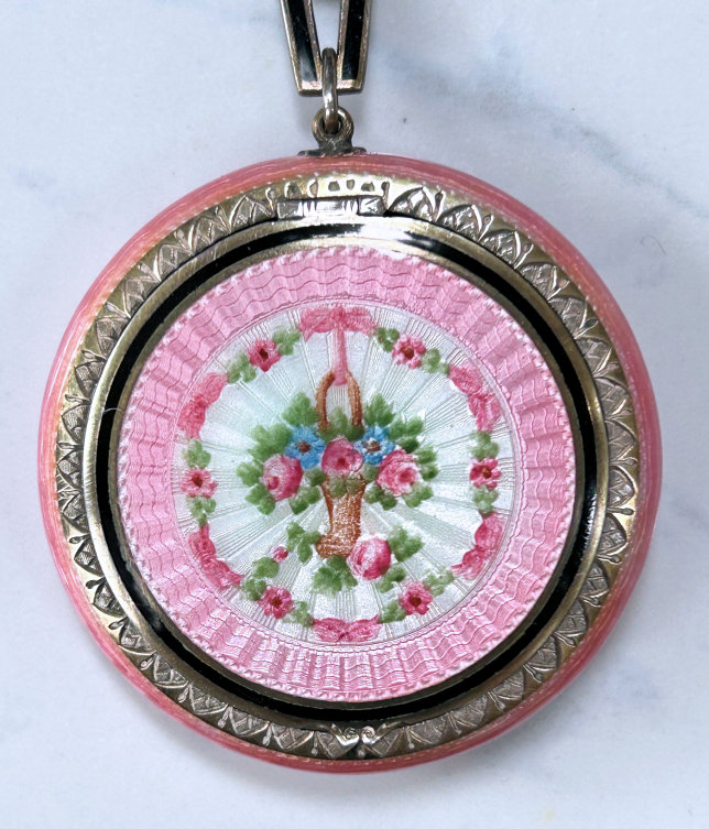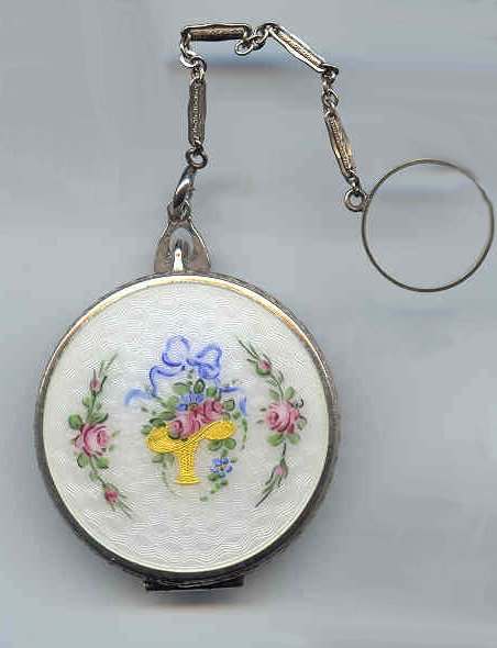 This pretty enamel guilloche compact features a snowy white front with a bright gold Victorian basket of roses topped with a blue ribbon bow. Rose garlands flank either side. Back of compact is finished in silver with engine turned designs. Sides of compact are richly emobssed as well as the chain links and finger ring that attach to it. Interior features a crescent shaped mirror and rouge pot with partially opened rouge pat. Base has a built-in rotating powder sifter. Excellent condition overall with a few faint surface scuffs visible when held to light. Measures 1-7/8" diameter. (Click on pic for more photos.) |