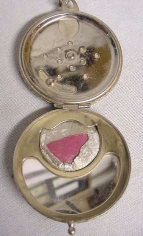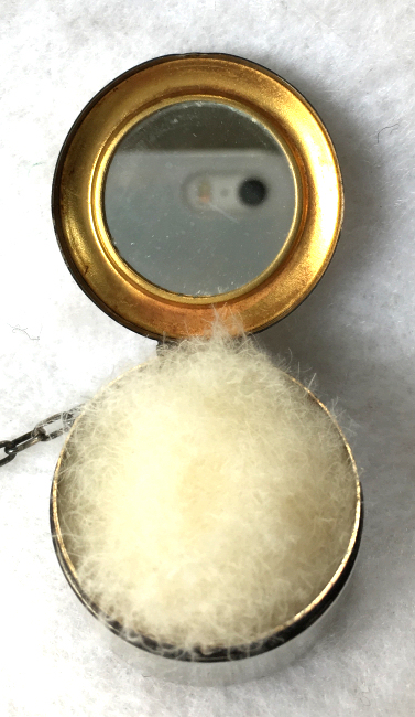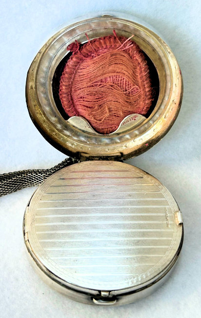 This is a darling little compact with finger ring by G. H. French Co. in sterling silver. The lid is a pretty candy pink enamel guilloche while the interior is fitted with a mirror in the lid and a cute original ruched lambswool puff with tiny finger ring in celluloid. It measures 1-1/2" diameter and is in excellent condition. (Click on pic for more photos.) |