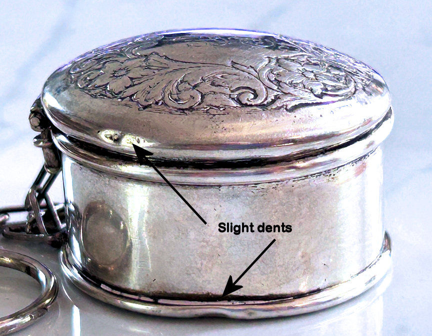 This is a very pretty compact made by Webster of Attleboro, Massachusetts, in the early 1900's. The lid is done in repoussé with initials MCG in the center that look like part of the design. Inside is a little round mirror in the lid and an original puff and powder pat in the base. The case, being sterling, does have a few dings as shown in the photos but truly not bad and taken into consideration in the price. The mirror inside has some foxing and a crack on one side but still usable. Measures 1-5/8" diameter x about 1" deep. Chain handle and ring are 4". The handle is removable. (Click on pic for more photos.) |