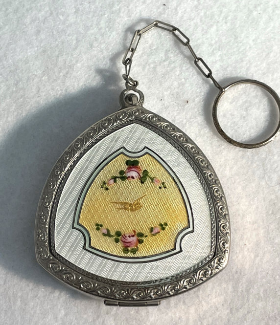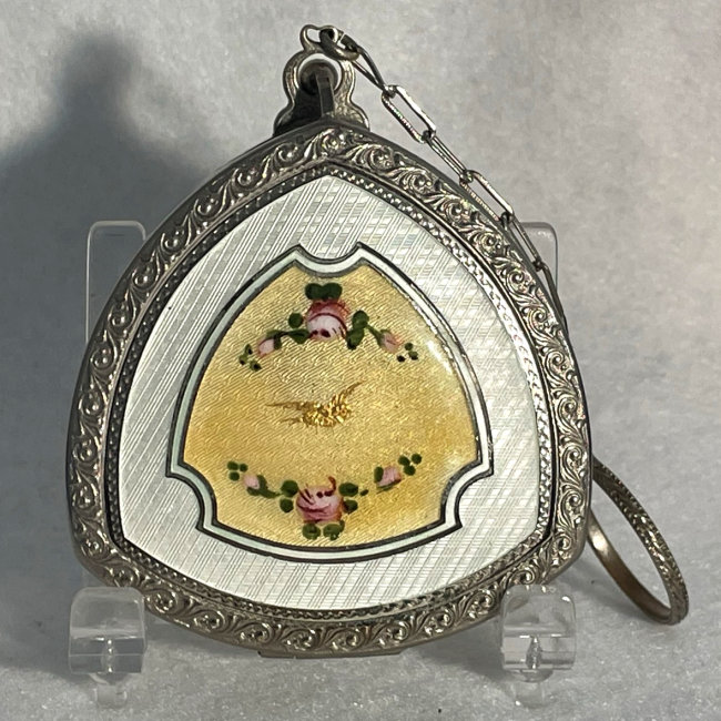 Here is a lovely little triangular shaped dance compact featuring a snow white enamel guilloche top with a center of pale yellow guilloche enamel with hand-painted roses and a little golden bird. The edges surrounding the enamel are richly embossed. The sides are polished and the bottom has a beautiful damascened design with a leaf in the center. Inside the compact is a tap-sift powder well in the base with original puff intact. The lid houses a crescent-shaped mirror in excellent condition with a rouge pot (also with original puff) beneath. There is a chain attached to the top with a a finger ring on the end ... perfect for dancing or attaching to a chatelaine. Overall this compact is in near perfect condition. If I want to be super picky, I could find a very tiny scuff on the surface but honestly can be felt rather than seen. It appears perfect at a glance and is very clean. Measures 2-1/4" wide x 2-1/4" high not counting clasp. Chain handle has 3-1/4" drop. (Click on pic for more photos.) |