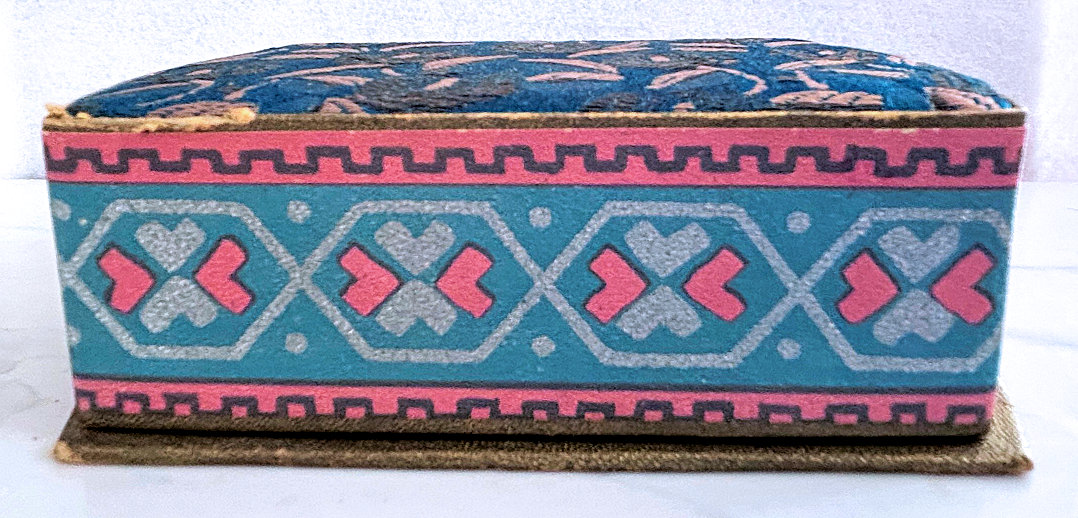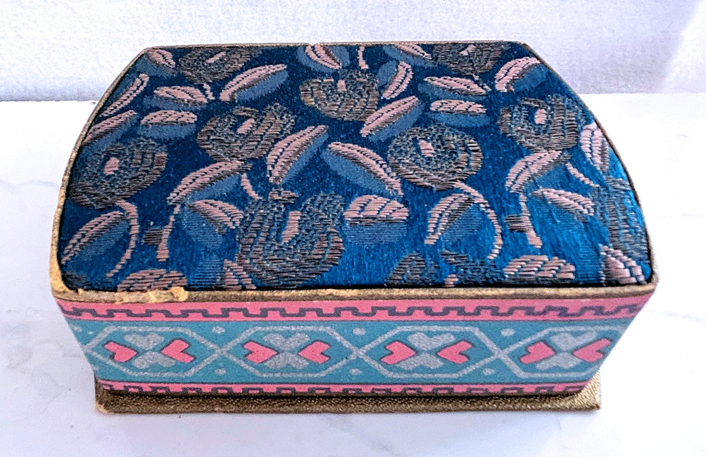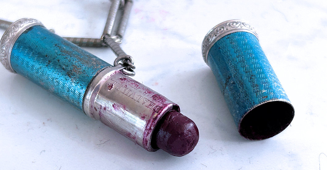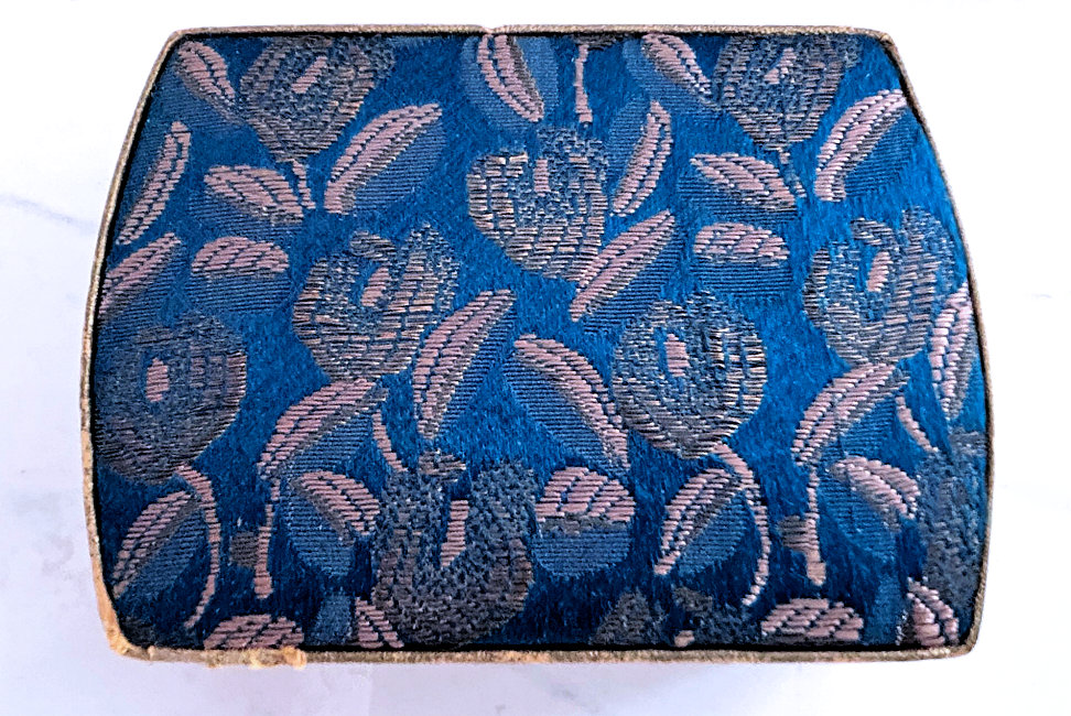 This is such a beautiful tango compact/lipstick in its original presentation box. Patented December 2, 1924, it is the Deauville design made by Richard Hudnut. Even though it has been stored in this pretty silk-covered box, this tango has been lovingly used over its 100+ years! Photos will show condition, but I will point out a faint hairline in the lid of the compact. The lipstick shows several areas of enamel loss, but still displays nicely from one side. The lipstick case has a blue "D" on one end and still has lipstick inside. The compact has a mirror powder pat on one side and a covered rouge pot and mirror on the other. There are two puffs inside although they are different colors so I am not sure if either is original or replacements. The cover on the rouge pot shows the date, Made in USA, Deauville, and Richard Hudnut. The chain and ring have embossed designs on them as does the edge of the compact and lipstick. Back of compact has damascened designs. Compact measures 2-1/8" diameter x 3/4" deep. Lipstick is 2-1/4" long. Box measures 4-1/4" x 3-1/8" x 1-1/2" high. (Click on pic for more photos.) |
