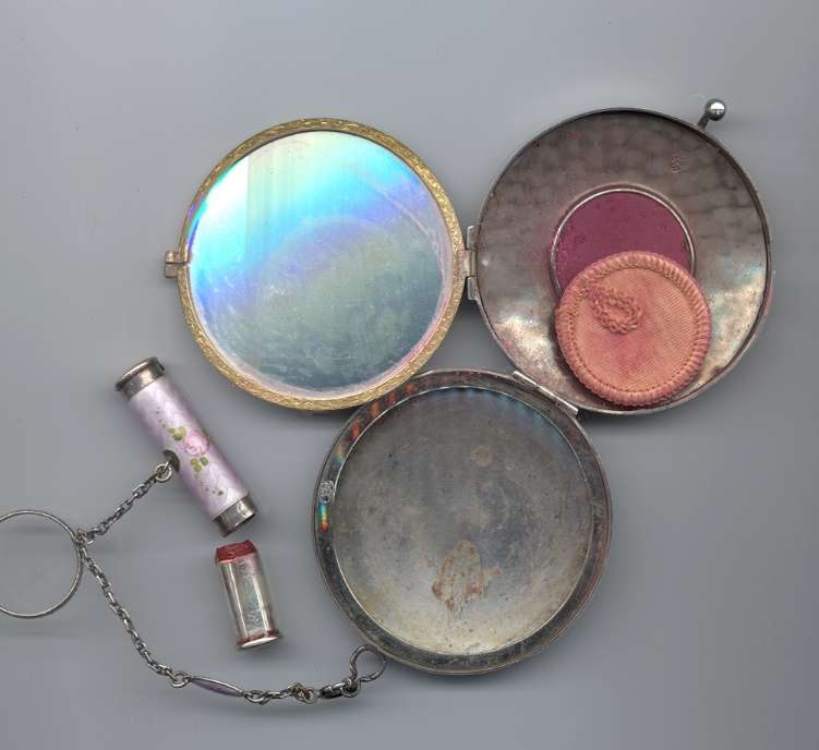 I have had this lovely tango in my own collection for several years and I hate to part with it. It is not perfect but because it is so unique and pretty, I had to have it. The color is a deeper Williamsburg blue with pink roses ... but what makes this stand out is that BOTH sides of the compact AND the lipstick have pink roses. I have never seen this before on a tango. The backs are usually plain. And the chain that connects the pieces is also blue enamel and these are near perfect. There is a wee bit of damage to the one end cap of the lipstick and the compact has damage near the hinge (worst area pictured) and the clasp on the rim. Both the top and bottom, however, are perfect. The interior has a crescent-shaped mirror with rouge pot on one side and a unique patented powder pat on the other side which is dated 1917. What appears to be an original puff is still inside. The piece is marked "Sterling" on the inside rim. Compact measures 2" diameter and lipstick is 2-1/8" long. (Click on pic for more photos.) |