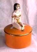 Subject: FULPER Cleopatra Powder Box Hi Kathy! She's here! She is wonderful!! I am totally delighted with her. I can't blame you for not wanting to part with her. She is gorgeous and the glazes are exquisite! Your service was great too -- she arrived without a mishap, though she was COLD (it's this weather) and she was packaged extremely well, even expertly. Hope to purchase from you sometime again. Kindest regards ...