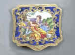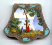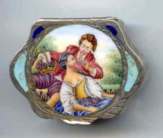 Subject: French Bronze Enamel Guilloche Mirror (only) Hi Kat, I received the mirror today and it's breathtaking. It's so large and striking! Wow. Although I read the dimensions on your site, I still didn't expect it to be so big! The portrait is one of the largest and loveliest I've ever seen on an antique mirror. I already possess several high quality French portrait mirrors and I've seen dozens of others, so I think I know . . . lol. The colors of this mirror are beautiful and the lady's 18th century period dress and hair ornamentation are gorgeous. Thank you so much for the layaway and the careful shipping. I knew I would love it! It caught my eye the moment I saw it on your site! :0) ........ Ligia Note: This purchase was for the mirror only, not the powder box. |