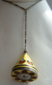 Subject: Egyptian Influence Sterling Silver Enamel Guilloche Pendant Watch Hello Kathy, The beautiful watch has arrived safely and has been ticking happily since. You are right, the watch is way better for real than the photos show. I am happy to leave well (enough) alone. It really does not need any restoring. Thank you so much for a very lovely watch which will be much treasured. Best wishes,