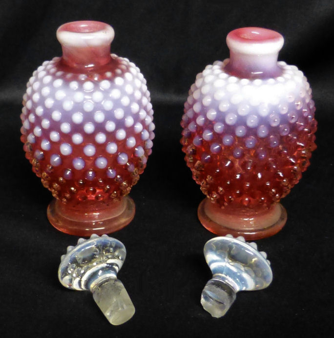 We have here a pair of Fenton cranberry opalescent hobnail perfume or cologne bottles with opalescent hobnail crystal tops. Excellent condition with exception of a chip on the end of one of the stoppers. Measure 4-1/4" high each. Previously listed for $360 Pair. (Click on pic for more photos.) |