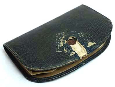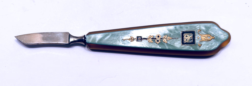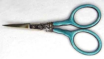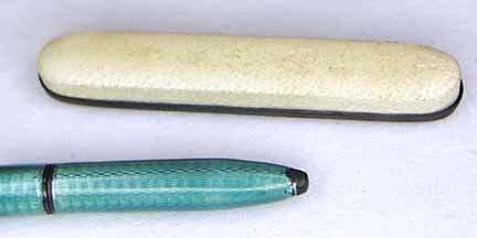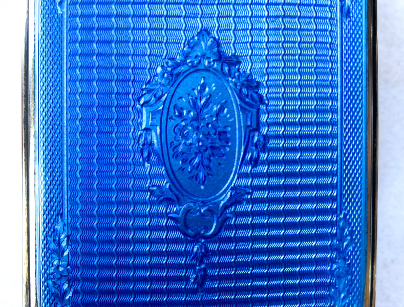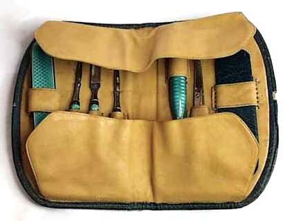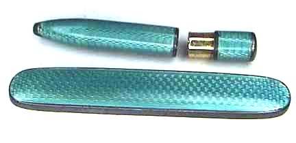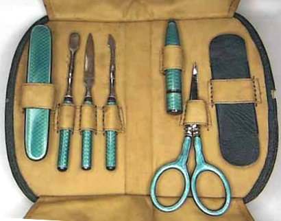 This is one of the prettiest enamel guilloche manicure sets I have run across ... in fact, it has been in my personal collection for several years now. The color of the enamel is a pretty, deep turquoise color ... much prettier than pics show. Enameling on all pieces is excellent with the only exception being a few tiny chips on the bottom of the needle case. Metal has some pitting. Case measures 4-1/4" x 2-3/4" closed; 4-1/4" x 6" when open flat (the closure flap is missing though). Previously listed for $550 Set. (Click on pic for more photos.) |