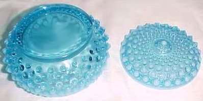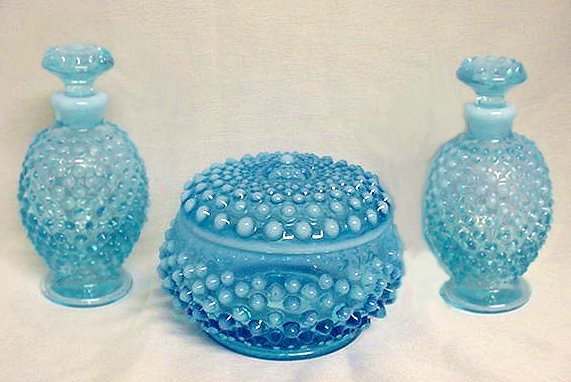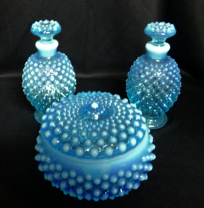 This is a lovely vanity set by Fenton in blue opalescent hobnail set featuring a powder box and two perfume or coloogne bottles. Powder box measures 4-1/4" diameter x 3-1/4" high to top of center hobnail. Cologne bottles are 4-1/2" high. Excellent conditon ... bottoms of stoppers have very very minior fleabites that were too small to photograph (really not even worth mentioning). Previously listed for $399 Set. (Click on pic for more photos.) |