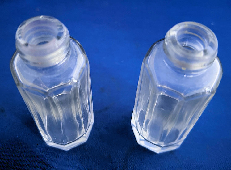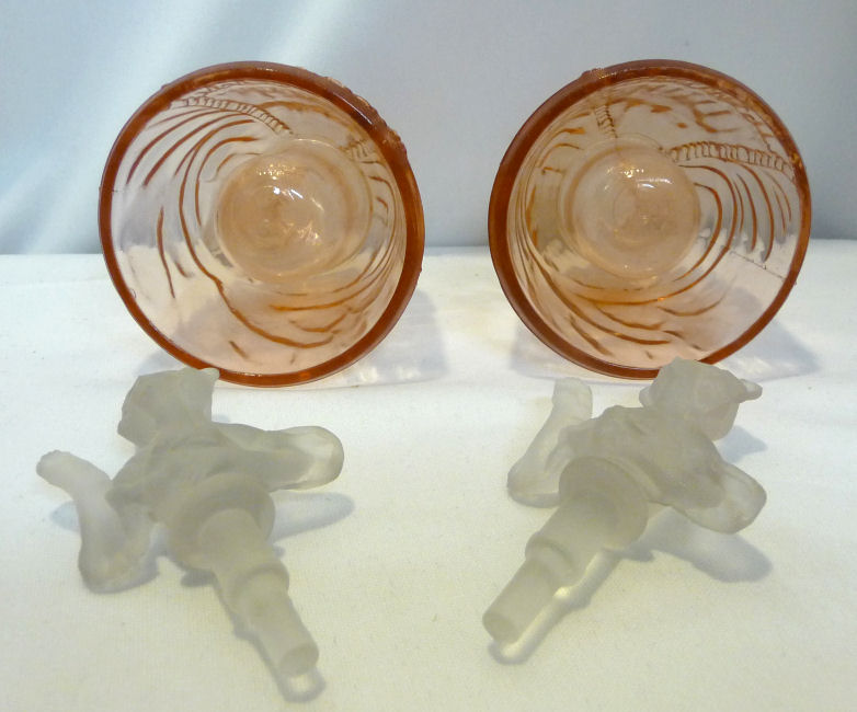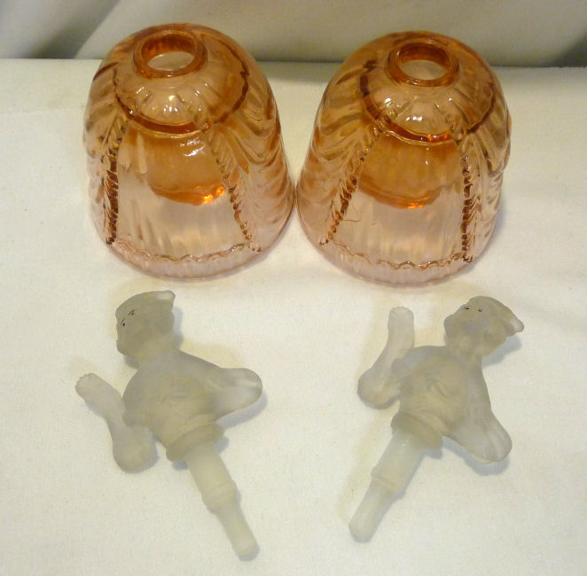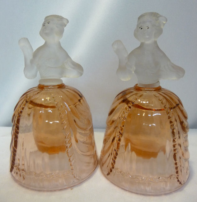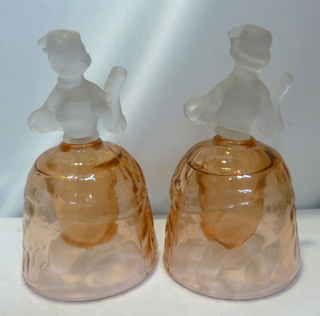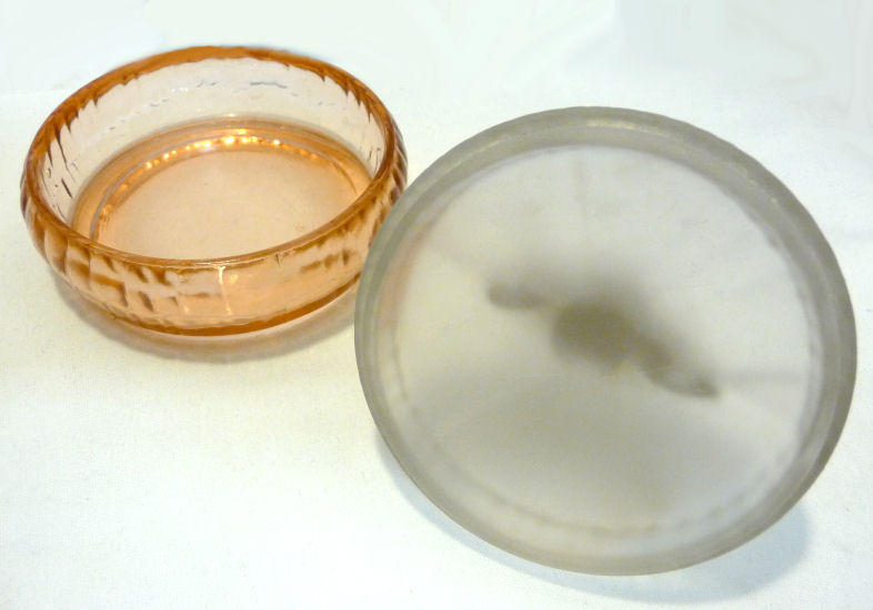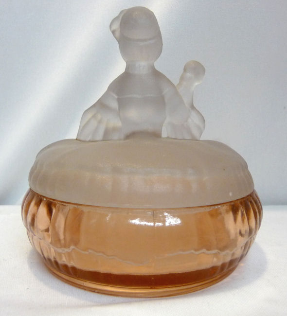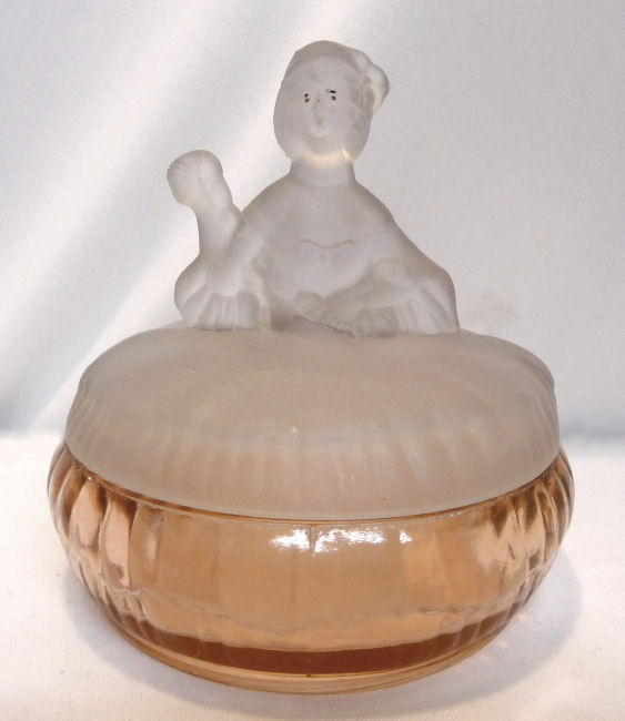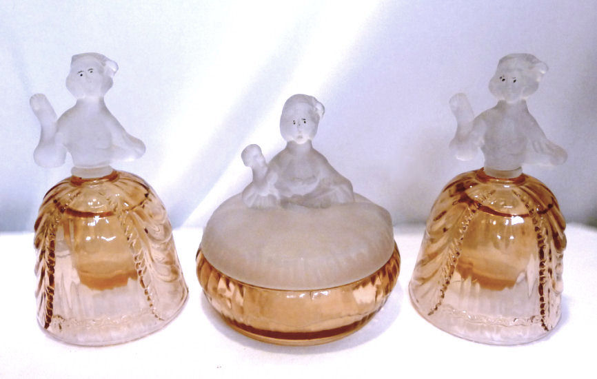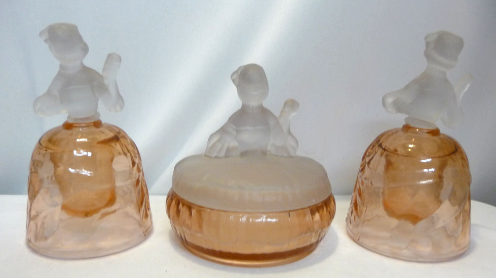 This is a very rare 3-pc. vanity set with full-figured colonial ladies ... their upper bodies are of frosted glass while the bottom halves which make up their full skirts are done in clear PINK glass. I had a really hard time capturing the true pink color ... my photos look more peach or orange tinted when in reality they are a true pink and MUCH prettier than these pics show. I do not know who made the set and cannot find out much about them ... they are pictured in Bedroom & Bathroom Glassware of the Depression Years on page 144. This set is in excellent condition and still has traces of the black eye paint which even the book's pictures are missing most. The puff box measures 4" diameter x 4" high. The perfumes are each 2-7/8" diameter at the bottoms x 4-3/4" high. (Click on pic for more photos.) |