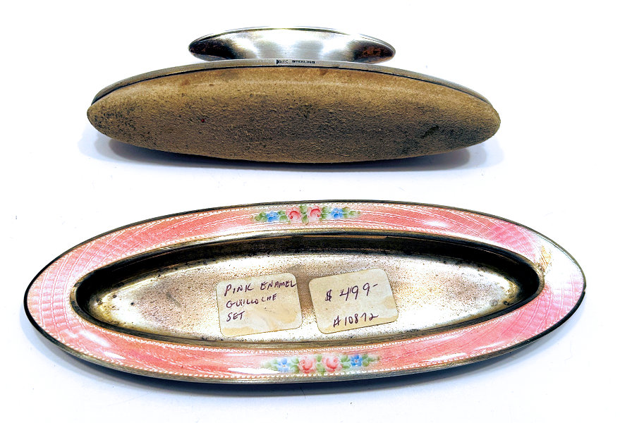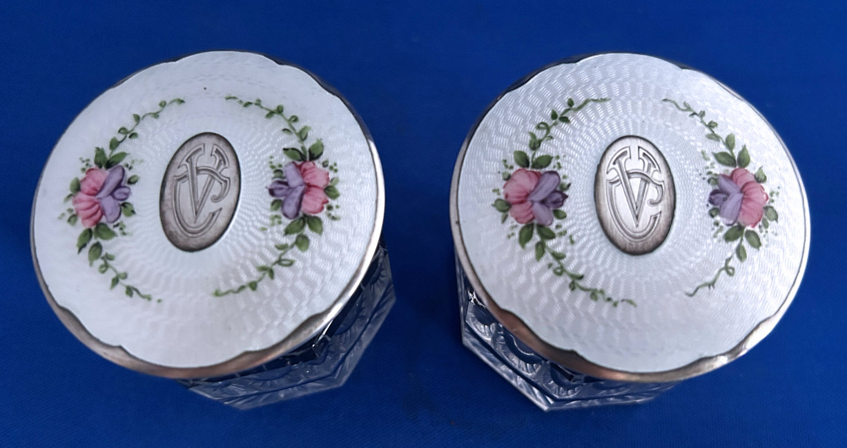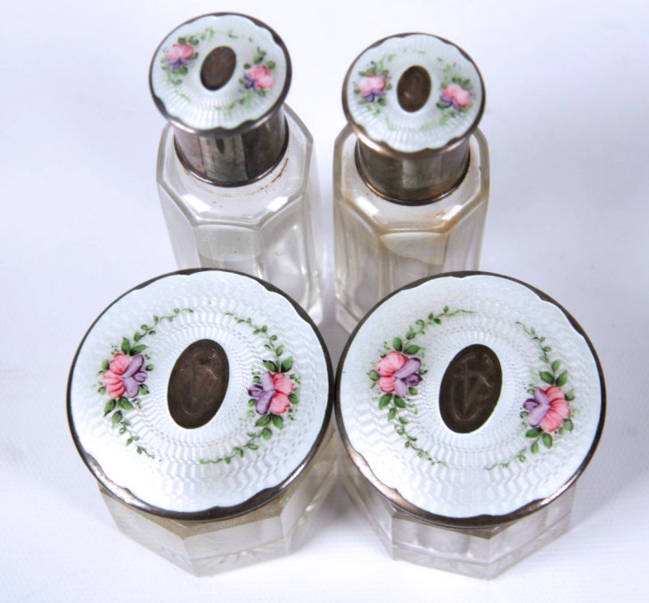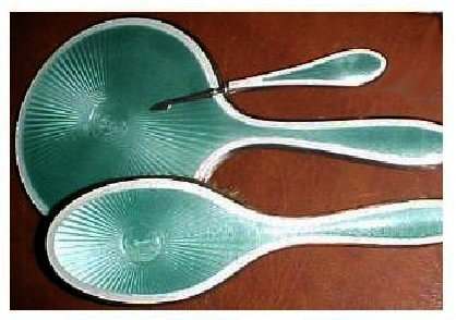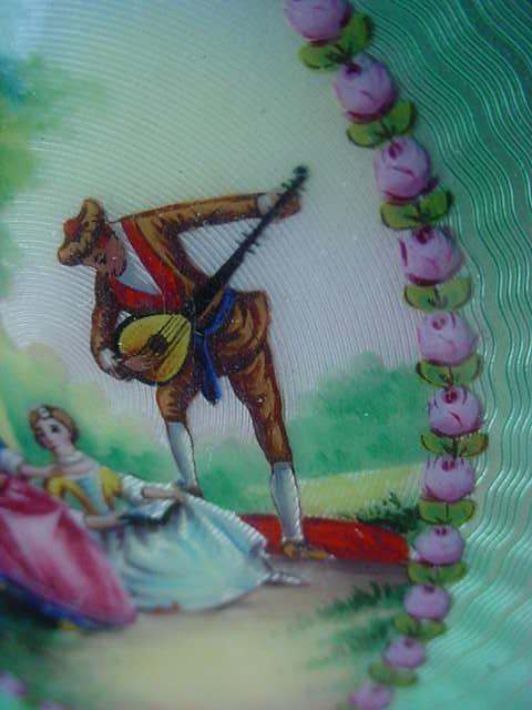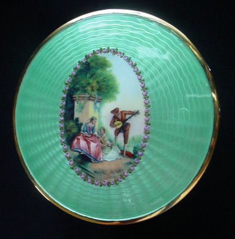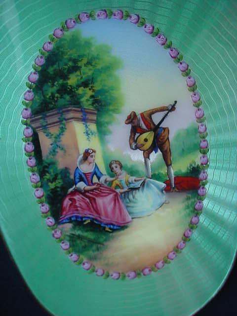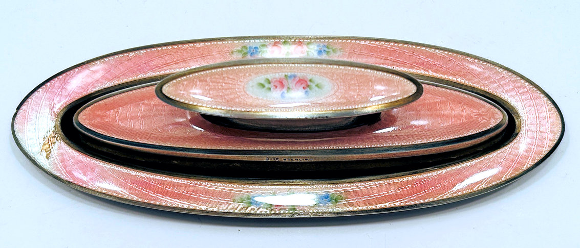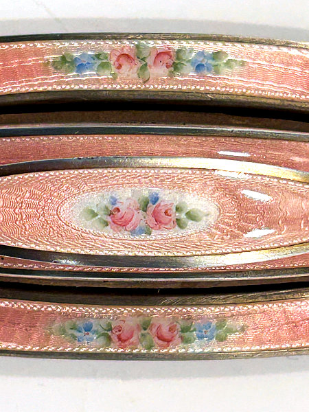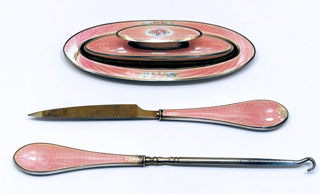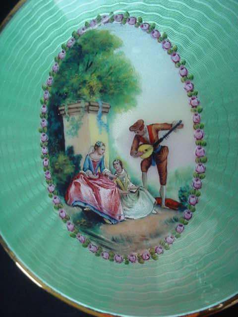 NOTE that the pieces with handles only have enamel guilloche on the top sides. (Click on pic for more photos.) |