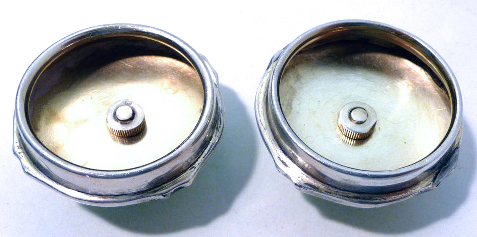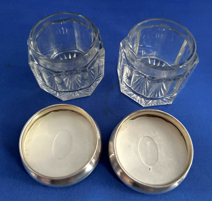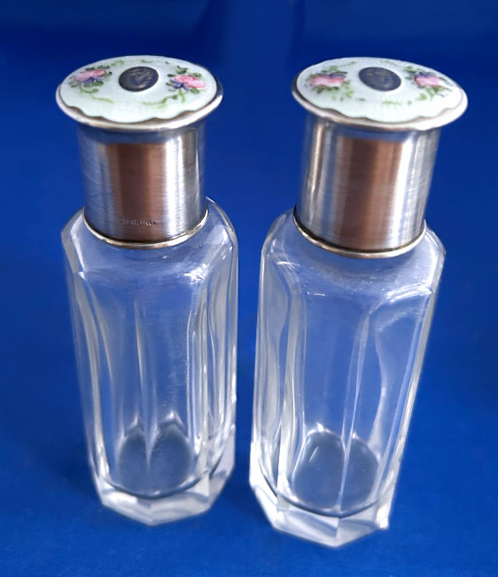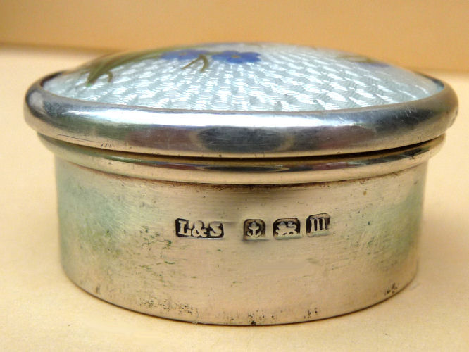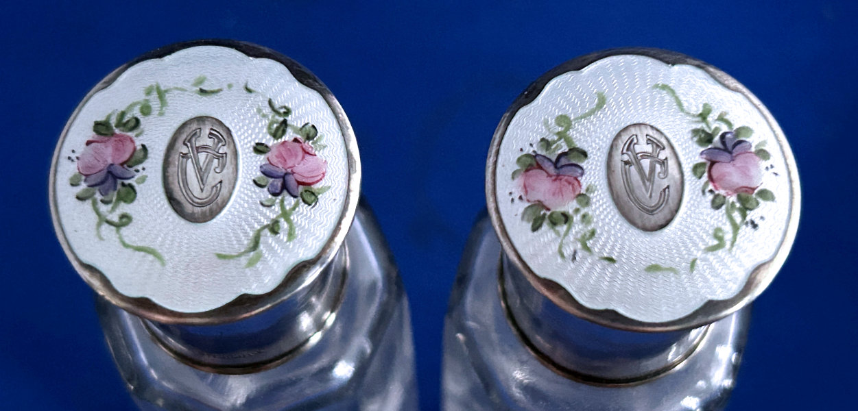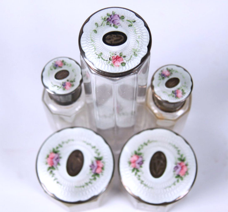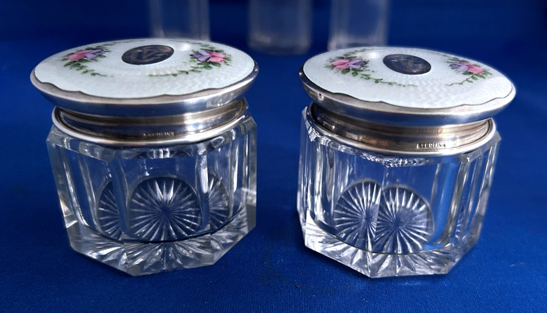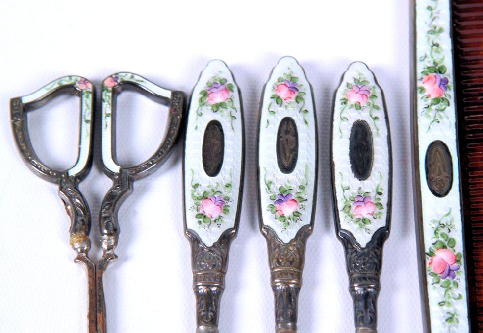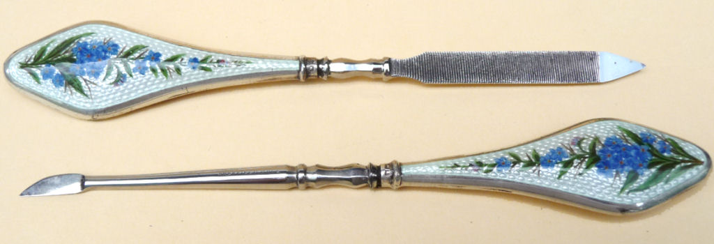 NOTE that the pieces with handles only have enamel guilloche on the top sides. (Click on pic for more photos.) |