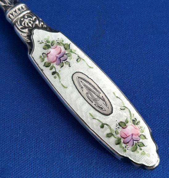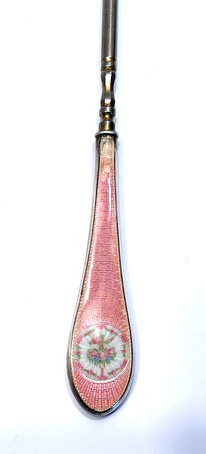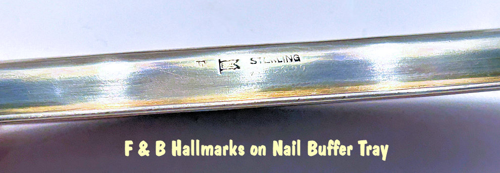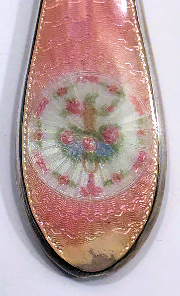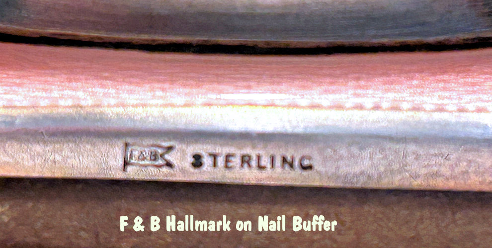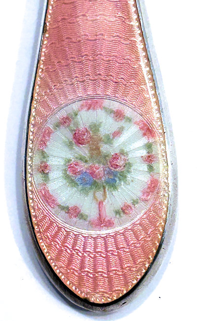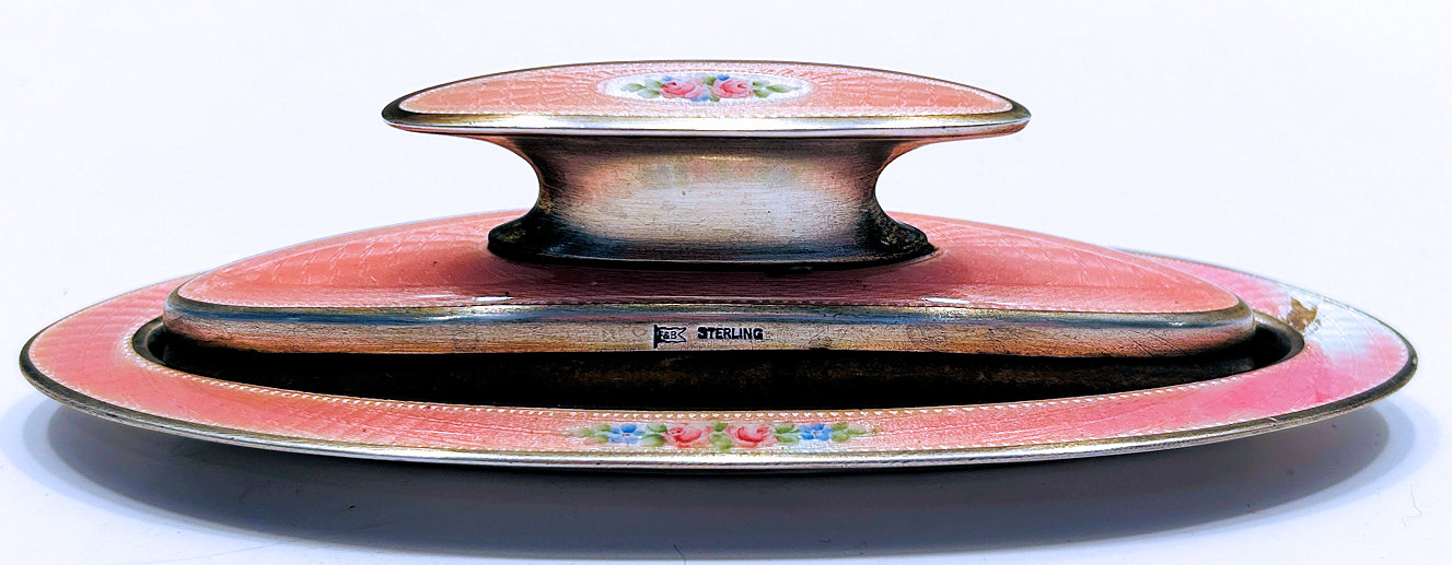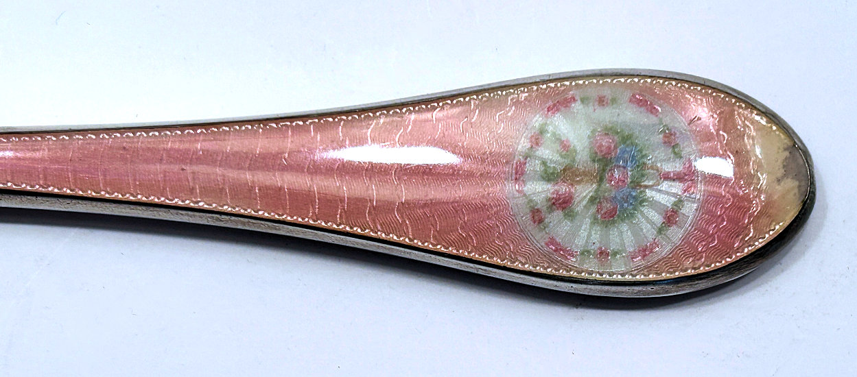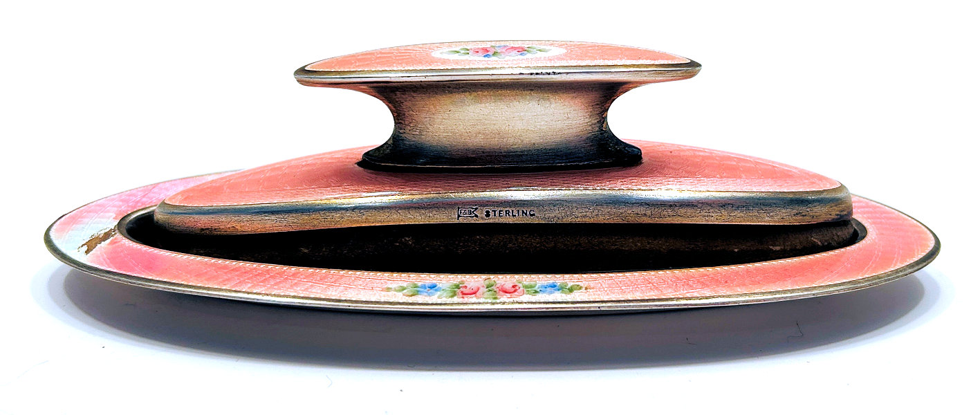 This beautiful sterling silver 4-pc. vanity set is done in pink enamel guilloche with hand-painted floral designs and was made by F & B of Providence, Rhode Island. The set has a nail buffer, nail file, and button hook. Every piece is hallmarked with the F & B flag logo as well as Sterling Silver. The nail file also has a hallmark "S & A New York" which might be the store that sold it. The pieces all have wear to the enamel but I bought the set years ago for my own collection and was able to overlook the flaws because the beauty of the set outshines the imperfections and it displays beautifully. It's hard to find these sets in perfect condition and when you do, the price is exponentially higher. Check out all the pictures and know that this set is totally usable even today. Measurements are: