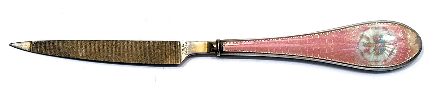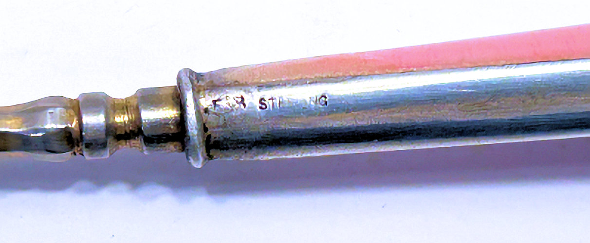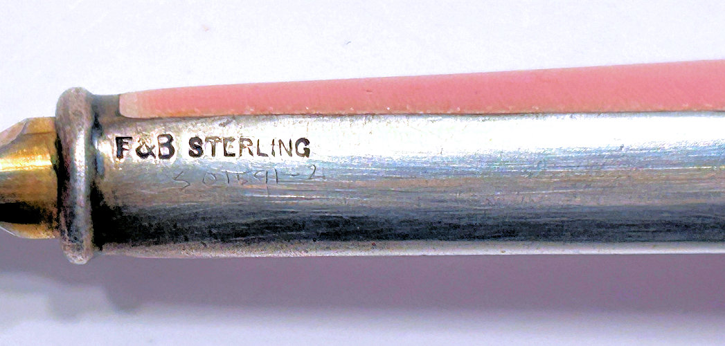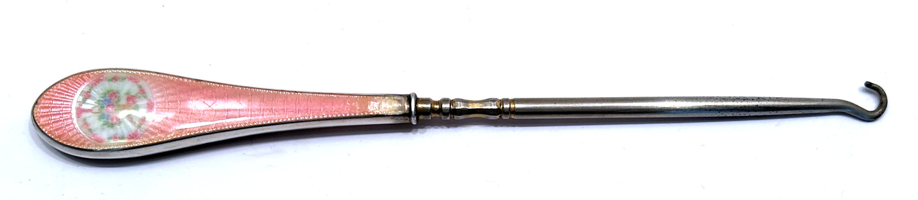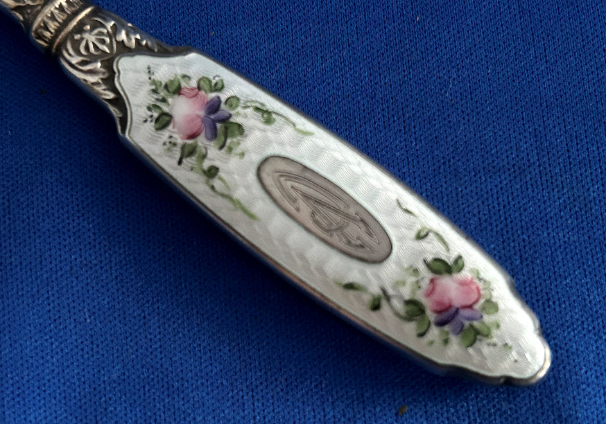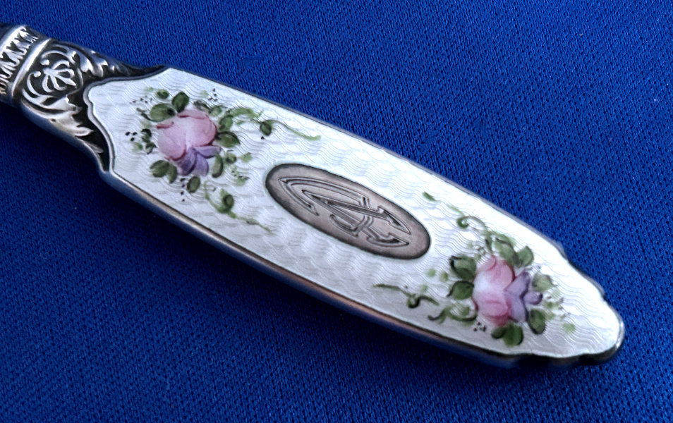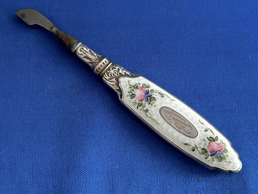 This beautiful sterling silver 4-pc. vanity set is done in pink enamel guilloche with hand-painted floral designs and was made by F & B of Providence, Rhode Island. The set has a nail buffer, nail file, and button hook. Every piece is hallmarked with the F & B flag logo as well as Sterling Silver. The nail file also has a hallmark "S & A New York" which might be the store that sold it. The pieces all have wear to the enamel but I bought the set years ago for my own collection and was able to overlook the flaws because the beauty of the set outshines the imperfections and it displays beautifully. It's hard to find these sets in perfect condition and when you do, the price is exponentially higher. Check out all the pictures and know that this set is totally usable even today. Measurements are: