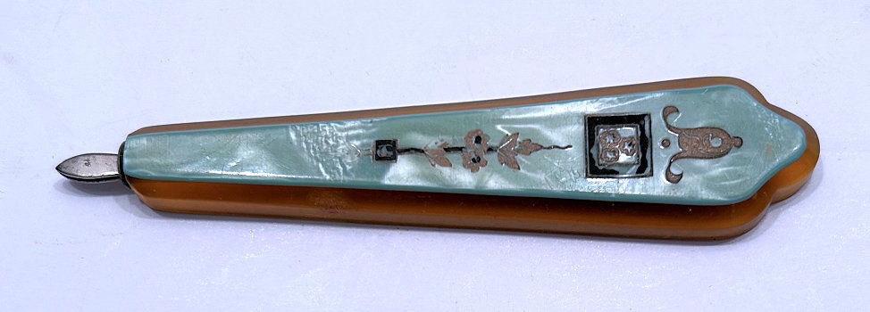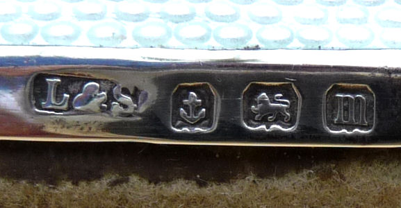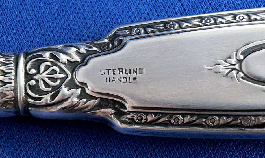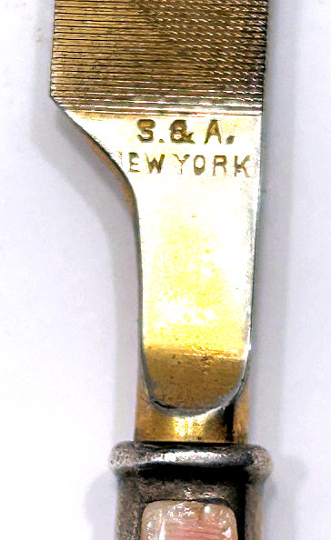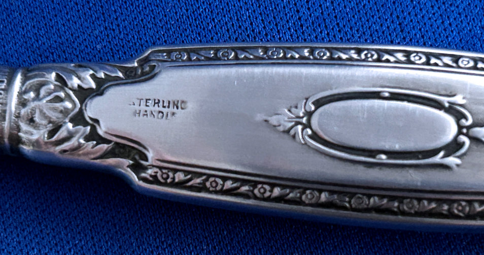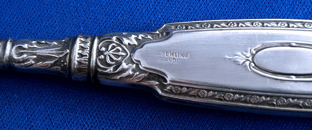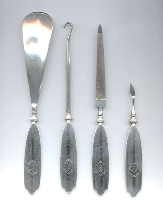 This is a lovely 4-pc. sterling silver manicure set made by LaPierre Mfg. Co. of Newark, N.J. They were in business from the late 1800's until 1929 when they were bought by International. There is a monogram on each piece which looks like MSM. There is a slight hammered design in the center of the handle which lends itself to the art deco influence of the industrial age. Previously listed for $195 Set. (Click on pic for more photos.) |
