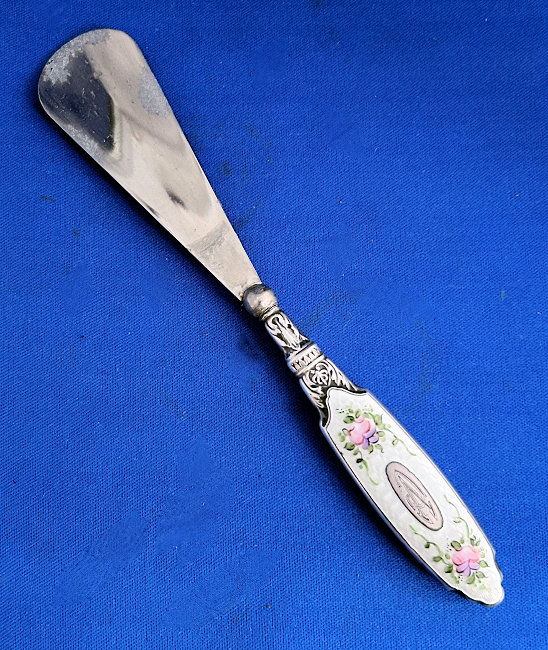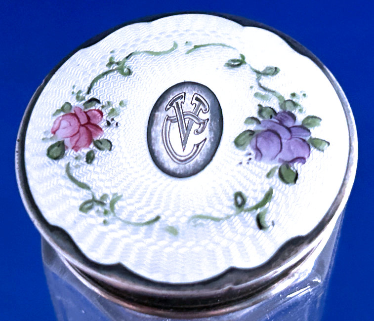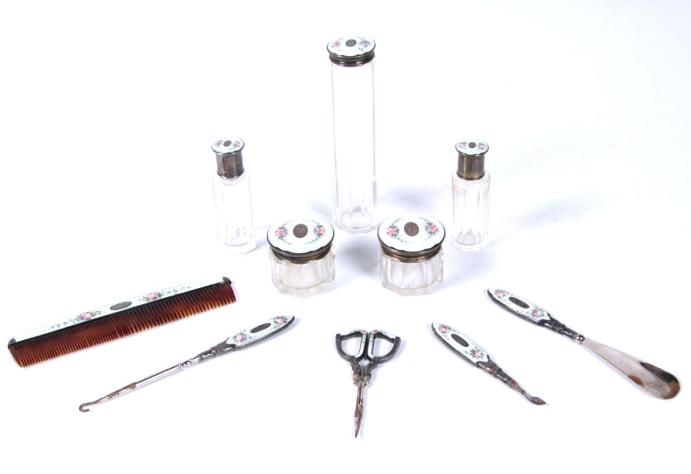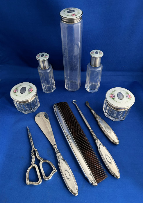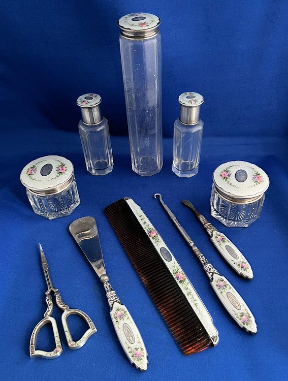 This is a fabulous sterling silver and enamel guilloche vanity set made by Saart Bros. of Attleboro, Massachusetts, probably between 1897 and 1920 as button top shoes were out of style after that. It is one of the most complete sets I have ever owned and is just gorgeous in person. The set consists of 10 pieces (15 pieces if counting jars and lids separately) including scissors, shoe horn, comb, button hook, cuticle tool, two small jars, two perfume/cologne holders, and toothbrush holder. The enamel guilloche is a snow white color with hand-painted pink roses on each. The design also allows for a center vignette where a monogram could be added and this one has two letters which look like "VC" but I can't be sure. You be the judge :-). ALL of the enamel is absolutely perfect; however, the shoehorn has significant loss to the horn portion as does the tip of the button hook, cuticle tool and scissors (this part of the set is not sterling, just the handles). The perfume and cologne bottles have different shapes to their stoppers to enable you to tell the difference between perfume and cologne. All of the glass pieces with exception of toothbrush jar have polished bottoms as well. The bottoms of the small jars also have beveled edges and one has an extremely tiny fleabite on one edge that is barely noticeable. All in all this is a fabulous set. I have added 34 pictures so you can see everything there is to see on these pieces. Measurements are: