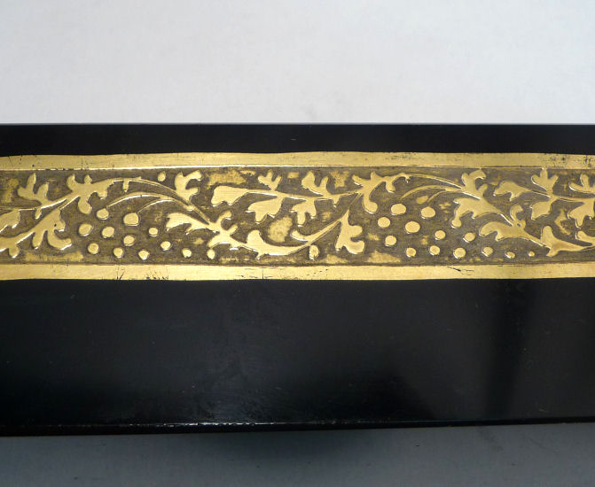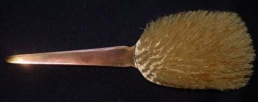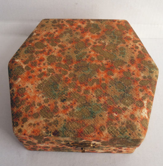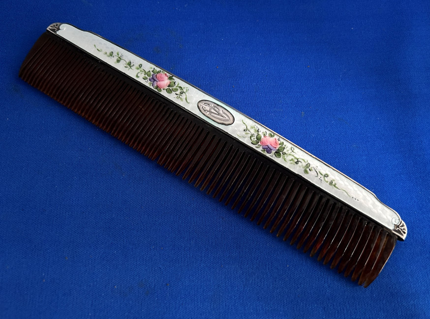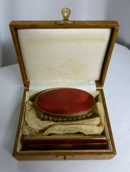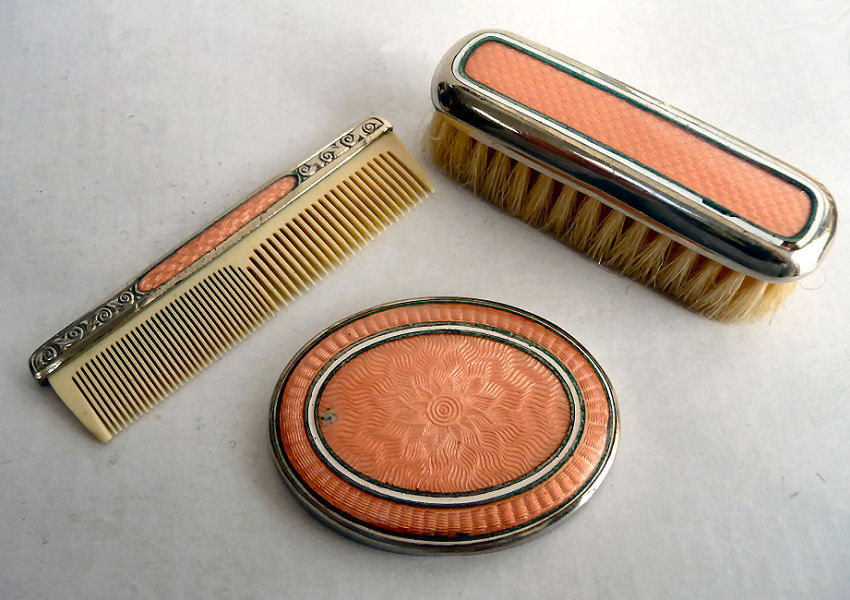 This darling little set is made to look like enamel guilloche when in reality it is a damascened base metal with a deep rose overlay. The inside of the case is lined in a beige velvet with accent twisted cable around the edge. The brush itself is natural bristles and the comb is torty. There is age appropriate wear to the metal and the rose finish but very minimal (see all the pics for close-ups). The brush measures almost 3" x 1-3/4" x 1-1/8" high , the comb measures 3-3/4" x 1" , and the box measures 4-1/4" x 3-1/2" x 1-1/2 " high. (Click on pic for more photos.) |