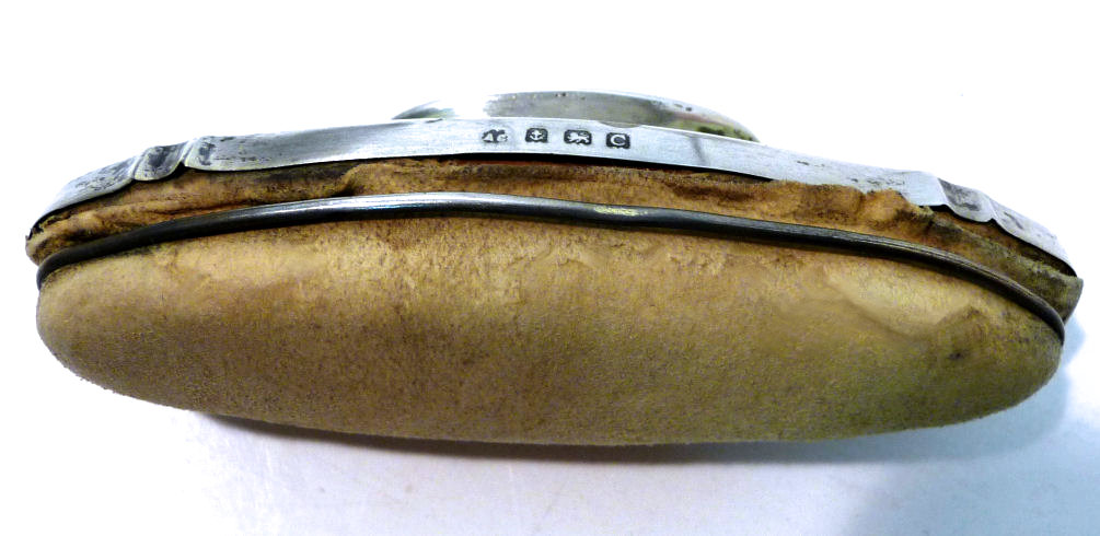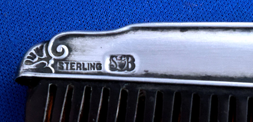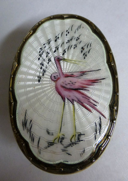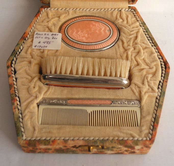 Lovely little sterling silver baby brush and comb set in a faux(? ... might be real) snakeskin presentation box. The brush is done in enamel guilloche with a pink stork hand-painted on the back. The mirror in the fancy lid has a nice wide bevel but is beginning to lose silvering around the edges (pictures show this clearly). Bristles are natural, probably boar. This is one of the finest baby sets I have ever had and it has been in my collection for many years. Perfect for a baby girl as the stork is pink but it would be great for any baby ... or adult! It would be a lovely addition to any vanity as it is just so pretty. It is marked Birmingham and I believe the year to be 1927. Enameling is in excellent condition. The comb is split inside the silver frame where one of the pins went through it but it stays in and is fine ... just needed to mention for accuracy. The brush measures 3-1/4" x 2-1/4" , the comb measures 3-1/2", and the box measures 4-3/8" x 3-1/2" x 2-1/4" high. (Click on pic for more photos.) |