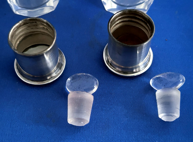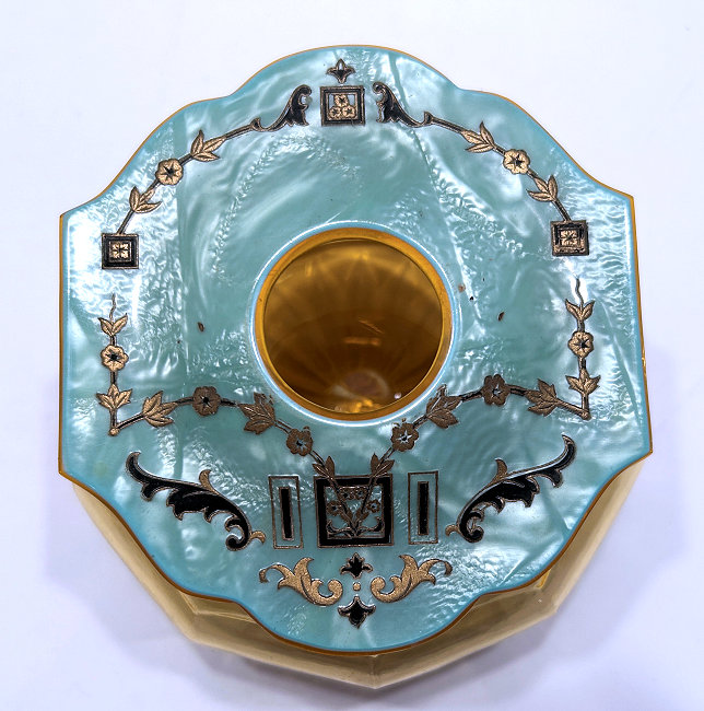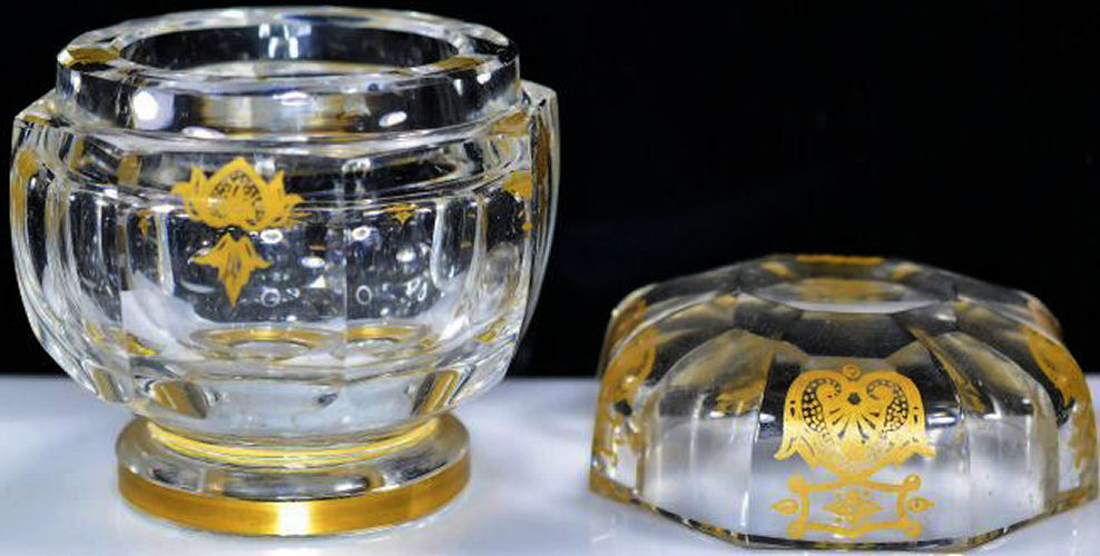 Gold gilt is all in perfect condition with no visible wear anywhere. Bases are also gold gilt. These pieces are extremely heavy lead crystal and the weight of all four pieces is 7 lbs. 12 oz.! (Click on pic for more photos.) |