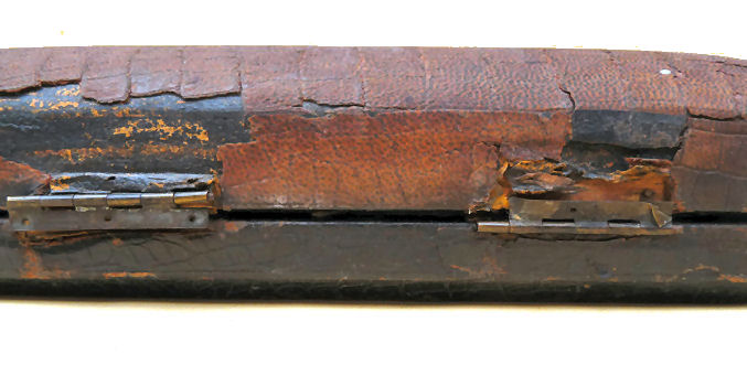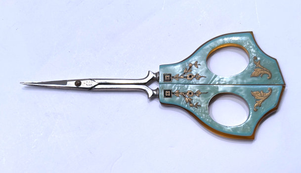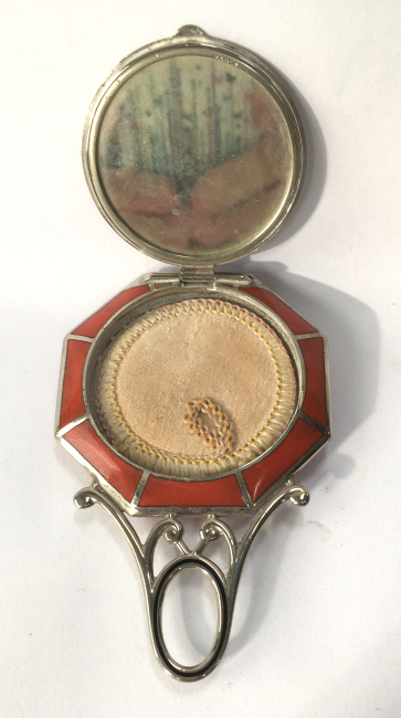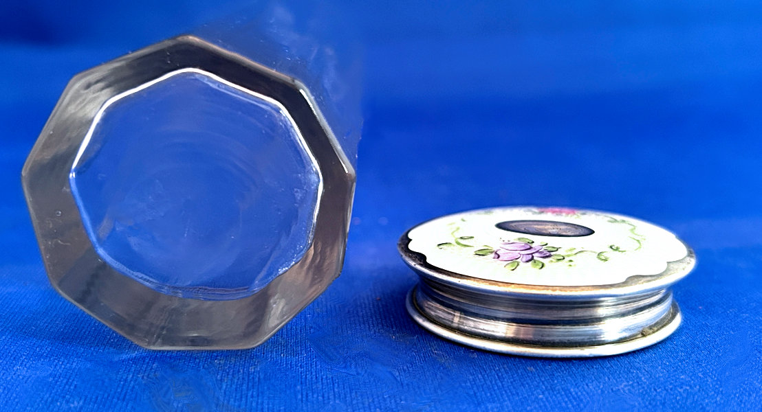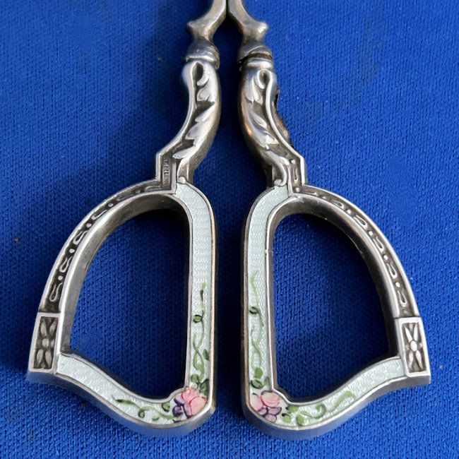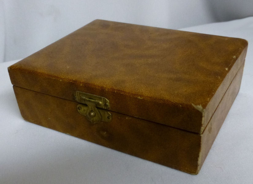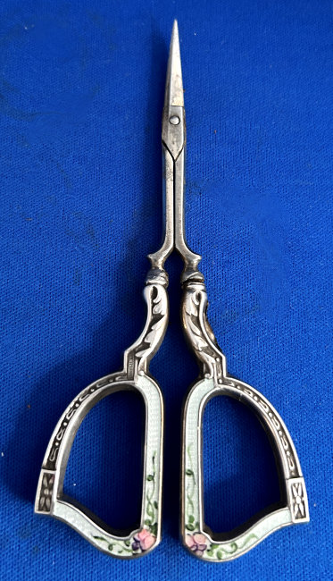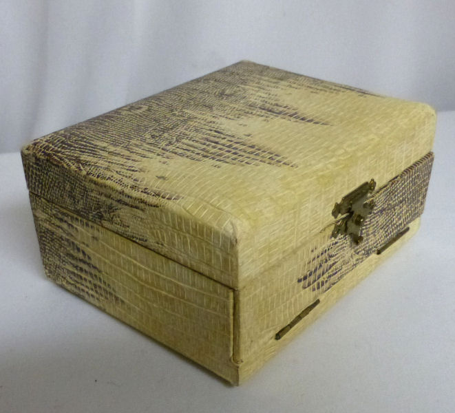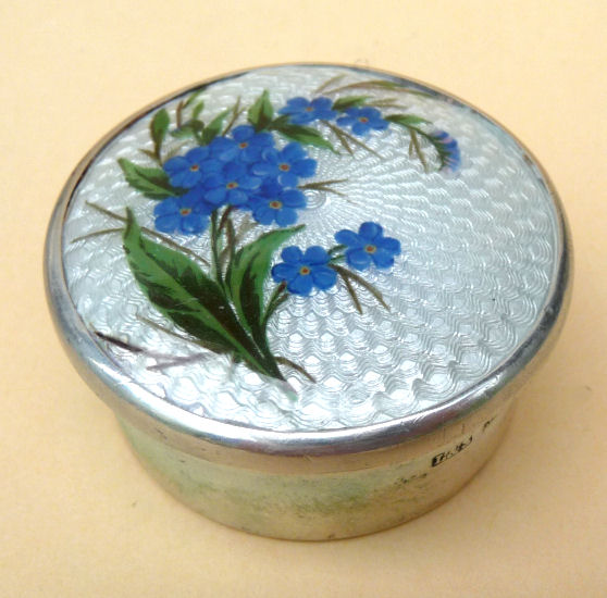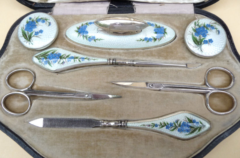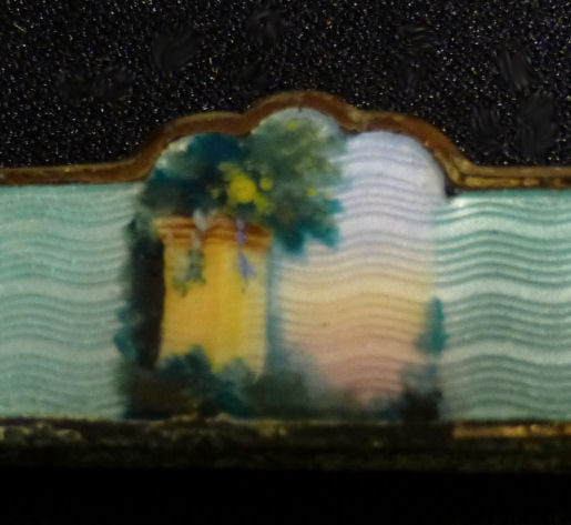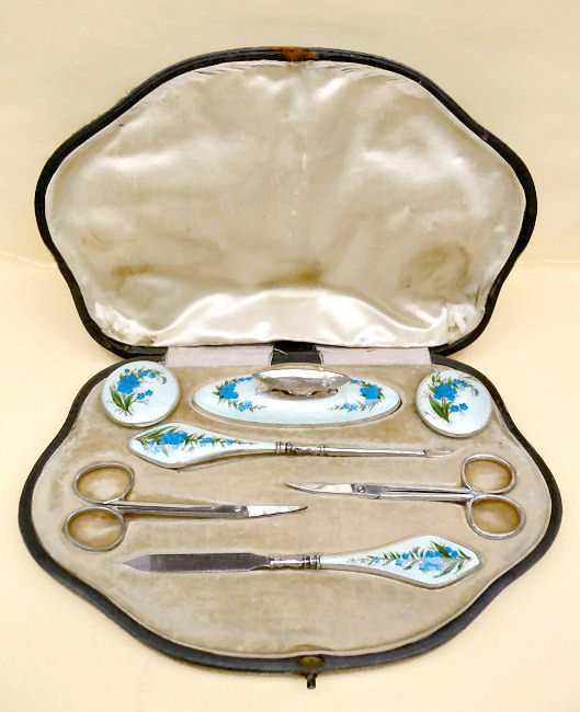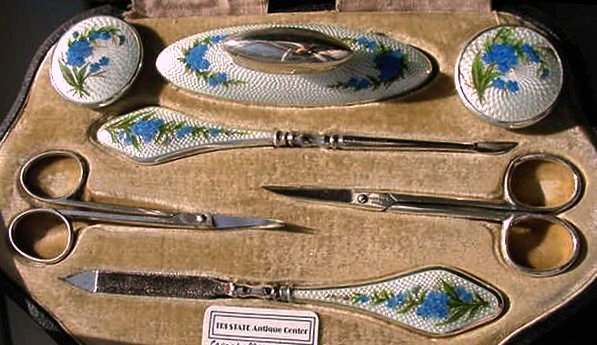 This is one of the finest manicure sets I have ever owned and I have had it in my personal collection for over a decade now. It is hallmarked from 1911 and was made by Levi & Salaman (read company information on the Compact Manufacturers page). The set consists of several hand-painted enamel guilloche on sterling silver pieces including two covered boxes (for rings or patches), a cuticle trimmer, nail file, and nail buffer. There are two manicure scissors included, one which is marked Sheffield. Enameling is in mint condition with no apologies whatsoever. All sterling pieces are hallmarked. The only problem at all is the hinges on the back of the case have come detached. The pieces are all there and the box holds together ... this could be fairly easily fixed and I will try to take care of it before selling. I just never bothered with it since it closes fine. The case is 9-1/2" long x 6" wide x 1-1/2" deep. The trinket boxes are approximately 1-1/2" diameter, the buffer is almost 4" long, and the two long tools are 6" long. This is a stunningly beautiful set and one that I have had to think hard about parting with but it's time to allow someone else to enjoy it. Be sure to view all the pictures to fully appreciate this wonderful set. (Click on pic for more photos.) |