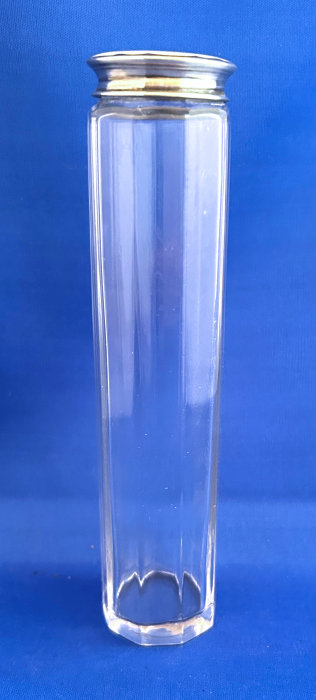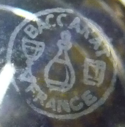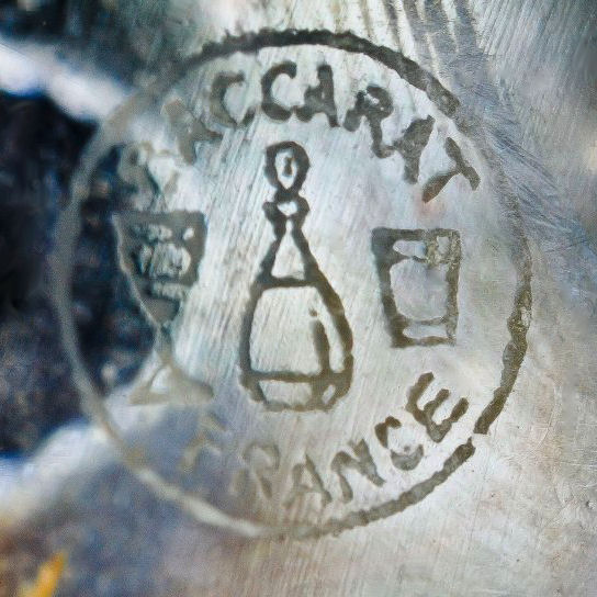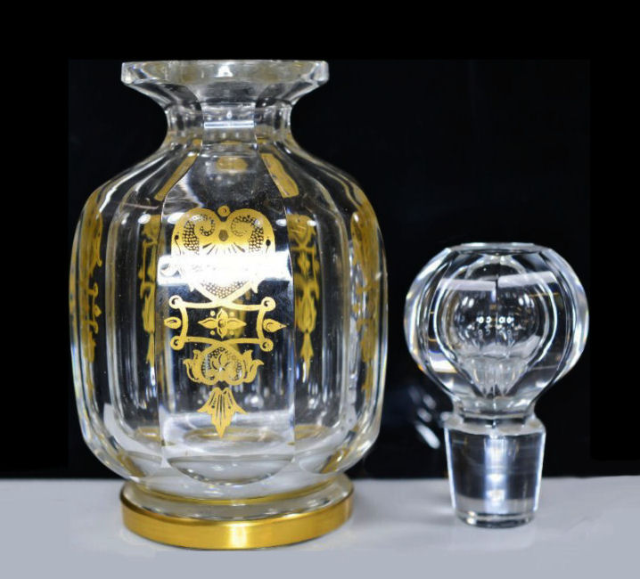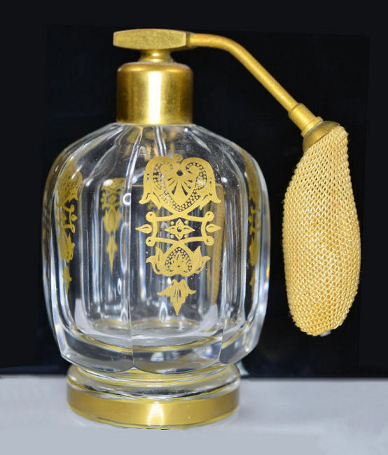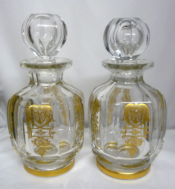 Stunning 4-pc. (plus lids) vanity set made by the prestigious French crystal company Baccarat. This set is done in gold gilt in the discontinued "Empire" design which is quite exquisite in its own right. I have not been able to determine when this was discontinued but I believe this set dates from the 1920's or 30's. Set consists of covered powder jar, perfume atomizer, and two bottles for perfume and cologne (difference in stoppers helps to identify contents). Each piece is signed on the bottom. The pieces are all panel cut and polished and the design is repeated in alternating panels all the way around the bottle and on the lid and base of the powder jar. Perfume atomizer is hardened and does not work but is original. It is pretty much perfect with no discernible damage of any kind (in fact, the only apology is the teeniest of fleabites on the base of one stopper too small to even photograph). Measurements of the pieces are as follows: