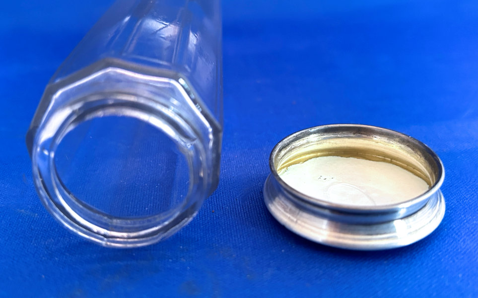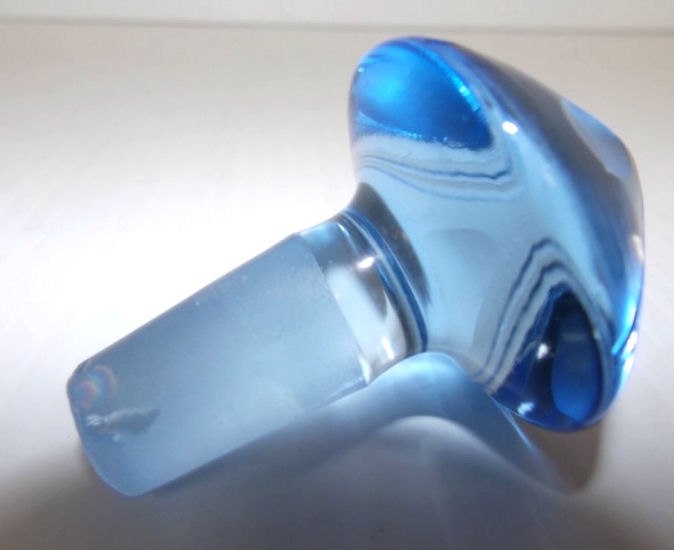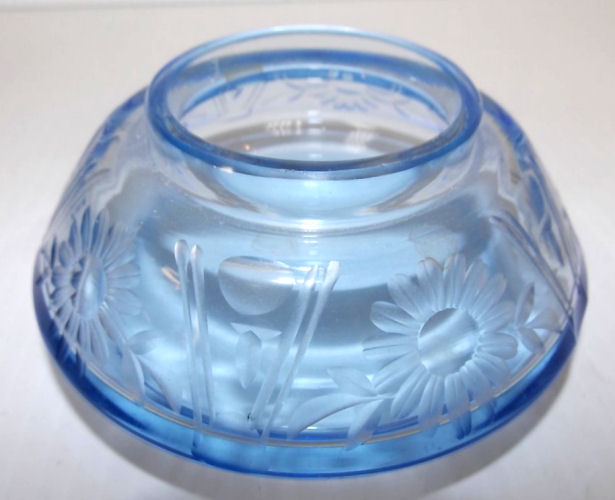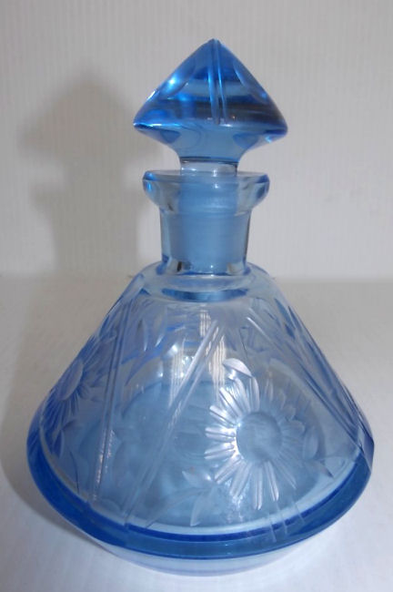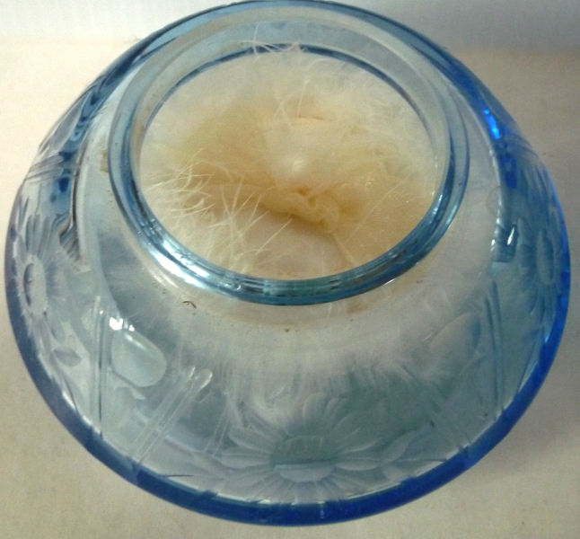 Here we have a beautiful antique blue etched glass dresser set consisting of a powder jar with sterling lid and maribou puff and a matching perfume bottle. Both pieces are deeply etched with flowers and flower buds all the way around with incised lines separating the flowers. The stopper lid has incised lines and thumbprint ovals. The lid on the powder jar is sterling repousse although unmarked. I am including a new ribboned maribou puff with lambswool bottom for the powder to adhere. Excellent condition throughout with exception of a few small chips on the bottom edge of the stopper (tip that sets inside the bottle). Perfume measures 5" tall x 4-1/2" diameter and the powder jar is 4-1/2" diameter x 2-1/2" high. (Click on pic for more photos.) |