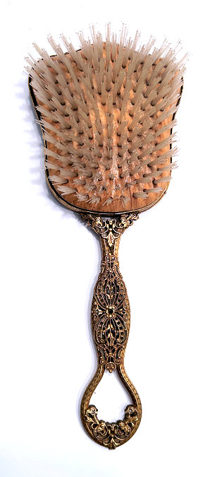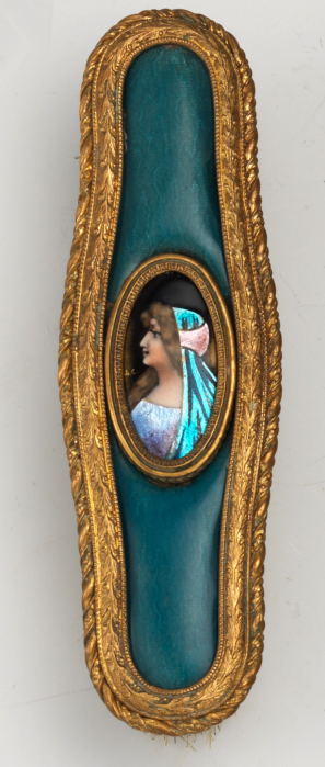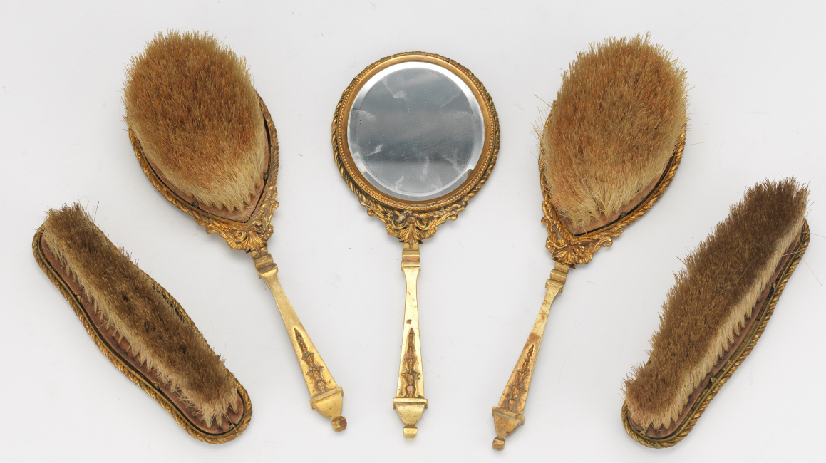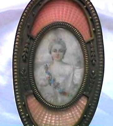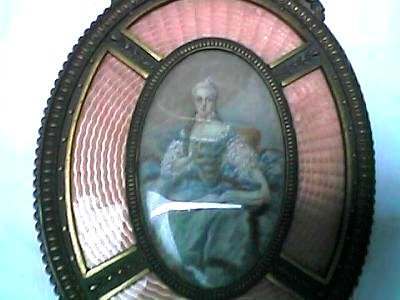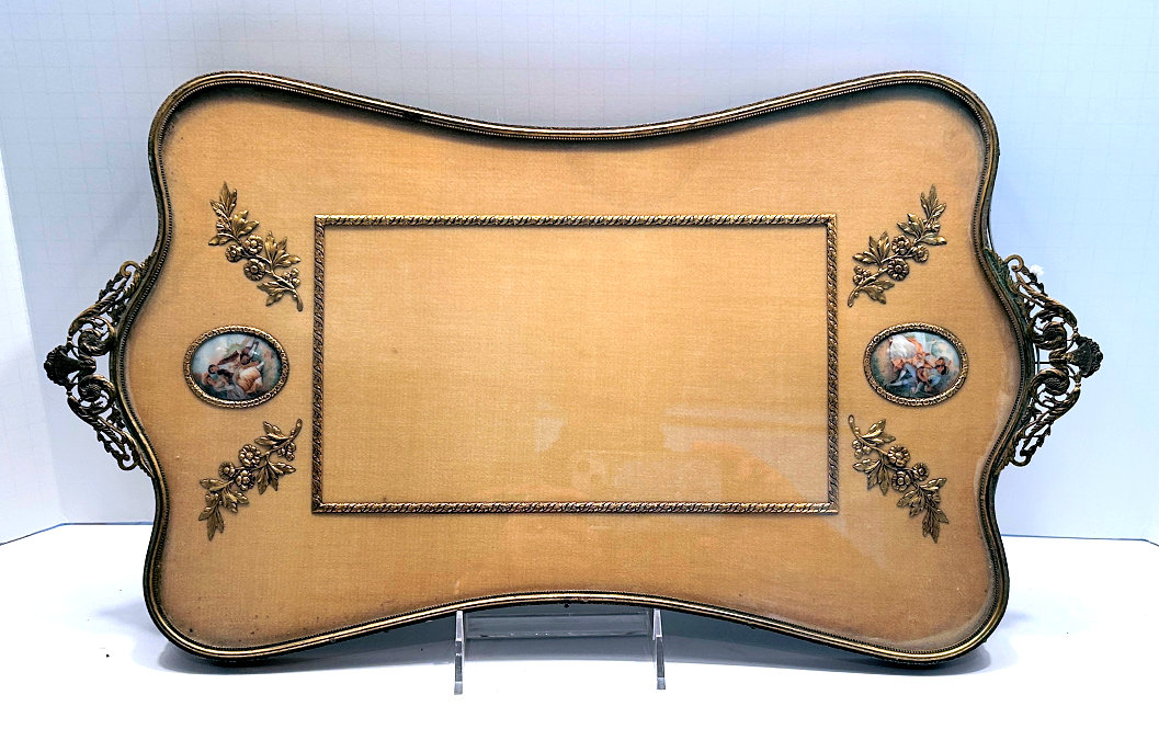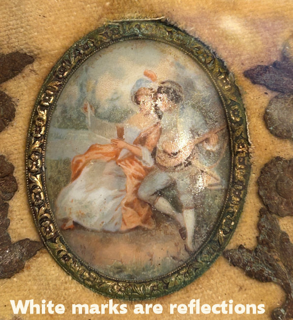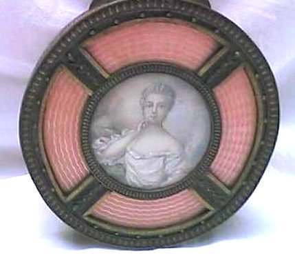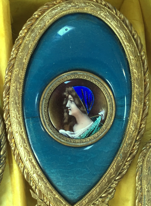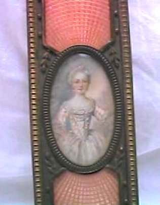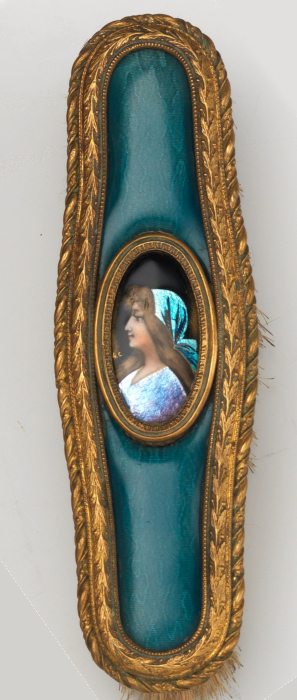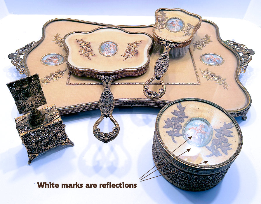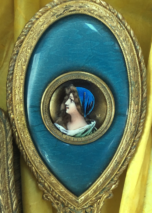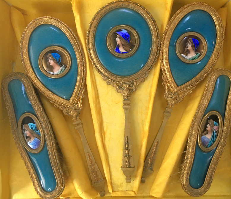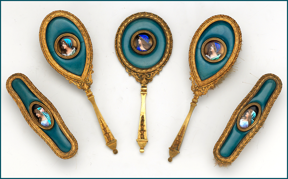 This is a beautiful enamel guilloche vanity set with hand-painted portraits on ivory beneath glass insets. Surrounded with peach enamel guilloche borders and set in rich filigreed French bronze frames. The portraits all seem to be of the same woman in different gowns. The artist's signature, while on each piece, is very difficult to make out. The set consists of oval beveled mirror, case for powder box (glass jar missing), hairbrush and valet brush. Now for the bad news: both brushes are missing. So while the set is absolutely stunning for display, it is not functional. It may be fairly easy to replace the bristles from another set but I have never tried to do that as I only used it for my own display purposes. The mirror measures 4-1/2" wide x 12-1/2" long. Hairbrush measures 2-3/4" wide x 9" long. Valet brush is 2" wide x 7-1/2" long. Powder or jewelry casket case is 4" diameter x 2-1/2" high. Previously listed for $995 Set. (Click on pic for more photos.) |