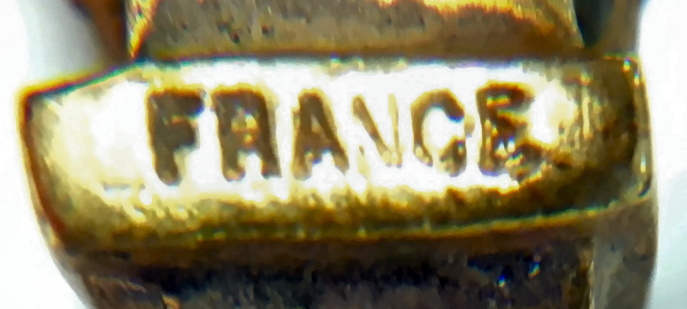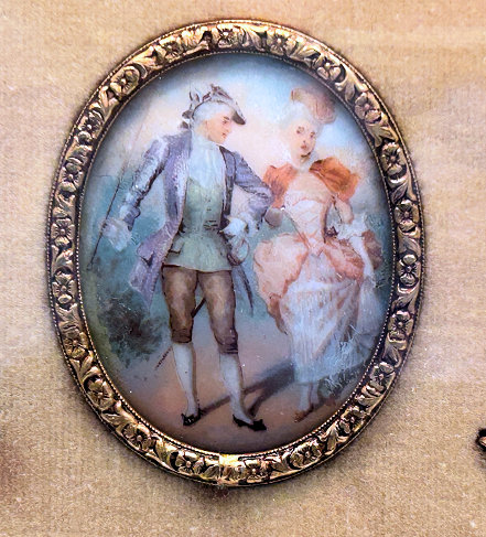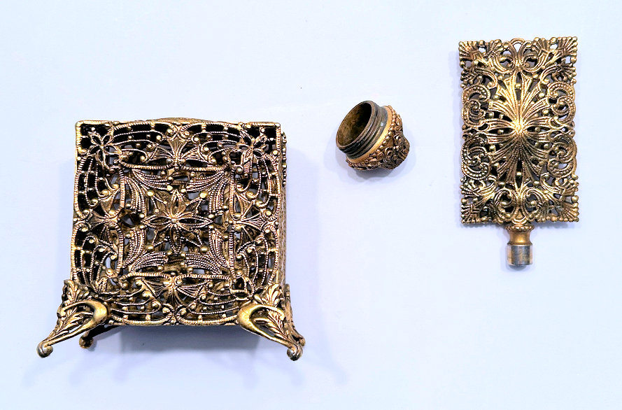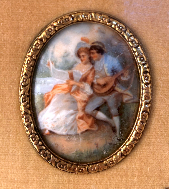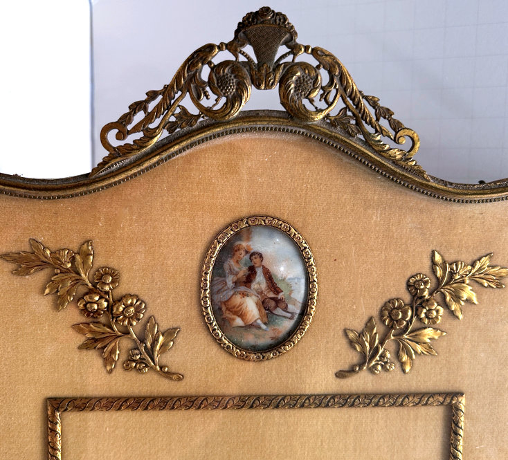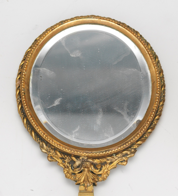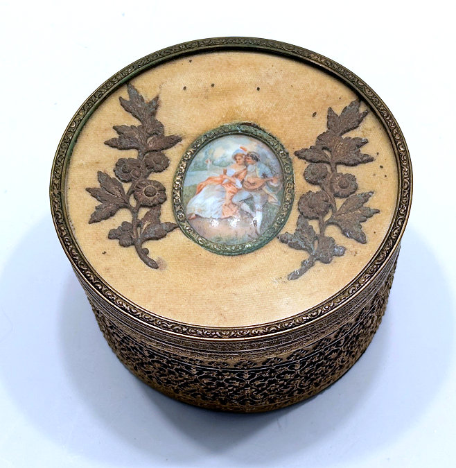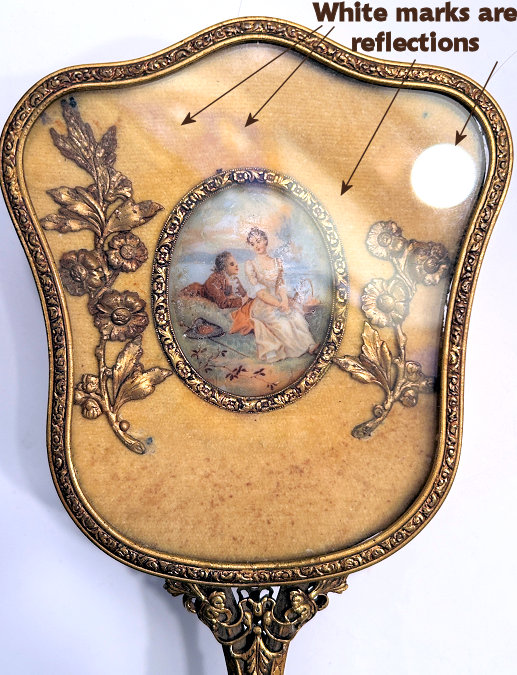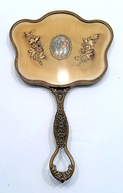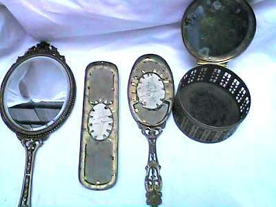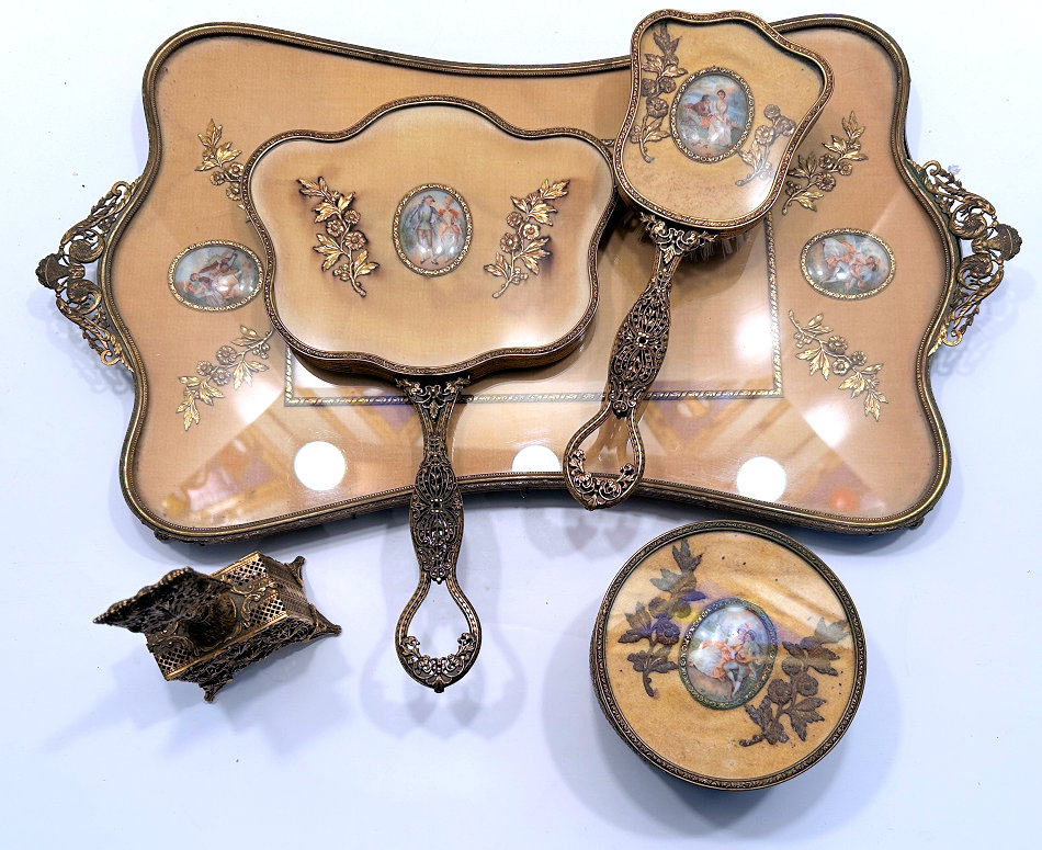This is a stunning vanity set consisting of 5 pieces (7 counting lids) in what appears to be French bronze although unmarked. Each piece with exception of perfume holder has hand-painted vignettes of a courting couple taken from famous paintings, most by Nicholas Lancret. They also have bronze ormolu decorations flanking each side of the paintings. The mirror is beveled and the jewelry casket has a mirror on the underside of the lid. The mirror on the lid of the jewelry casket does show significant wear but still has clarify in the center. The perfume holder is not functional ... the glass insert was broken years ago so it is for display only although it could be used as a vinaigrette as the holder is open filigree. The large stopper can be removed or unscrewed (see pics). I was unable to find a marking on it but I did not remove the covered bottoms where the marks would be found. As for condition, all of these pieces are on a fabric background and some debris can be seen under the glass. I did not take pieces apart to clean but I think this would be fairly easy to do. Most of it looks like it could be dustred off. Pieces measure as follows: