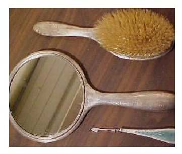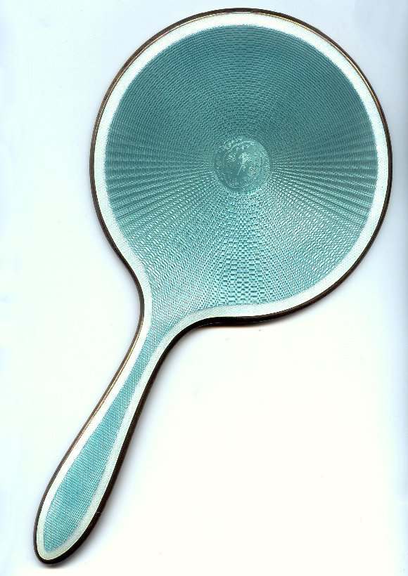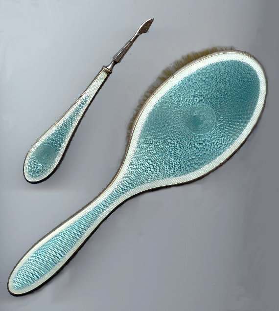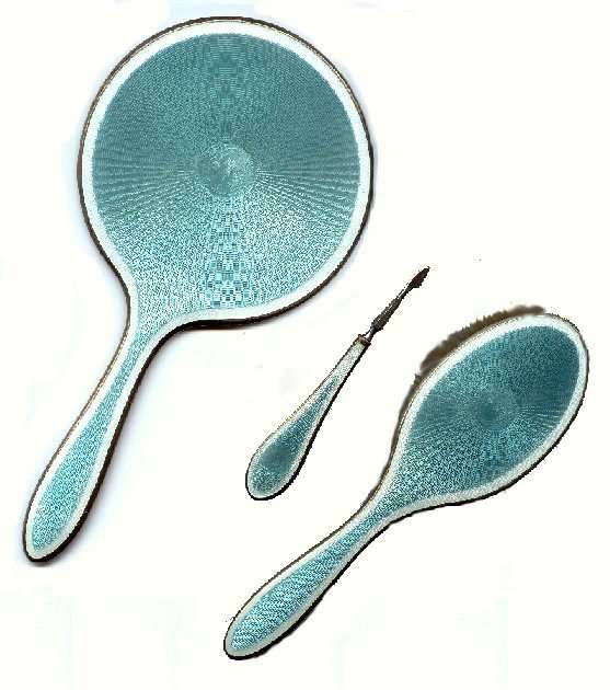 F & B has long been known for their exceptional enameled vanity pieces ... mainly compacts ... and it is rare indeed to find a vanity set made by this prestigious company. The color of the enamel is a soft aqua with a snowy white border. This is a beautiful set in excellent condition for its age. All pieces are marked F & B and Sterling. Measurements of pieces shown on the pictures. Previously listed for $550 Set. (Click on pic for more photos.) |