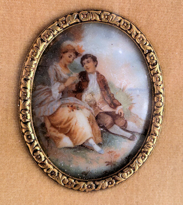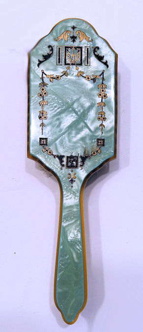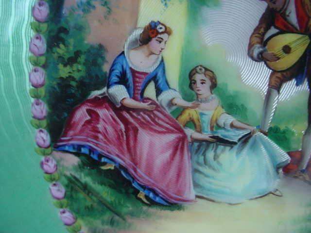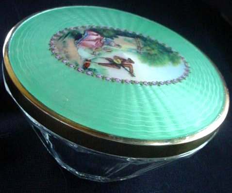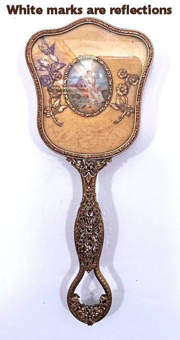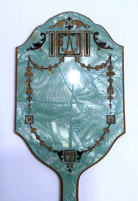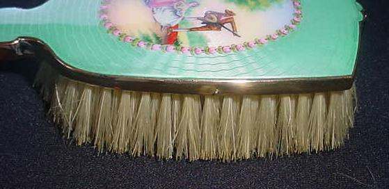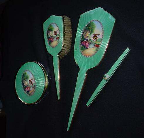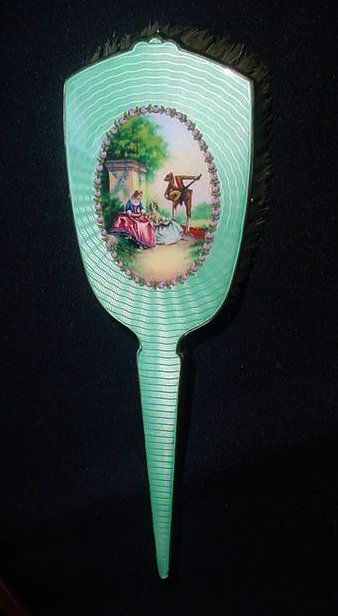 This spectacular dresser set is one of the finest I have owned. It consists of four pieces: large beveled mirror, hairbrush with natural bristles, covered crystal powder jar, and comb holder. Each piece is done in a pretty soft mint green color enamel guilloche with a hand-painted figural scene on the back (except the comb holder which has a scene but no figures). All of the enameling is in excellent condition with no chips or repairs whatsoever. At the very tip of the brush, there is a tiny hairline crack in the enamel. It blends in with the design and is so small it's really not even noticeable. The covered powder jar is made of the finest crystal with polished base and rim and is also in excellent condition with no chips. The hand mirror has a gorgeous beveled edge to the mirror that measures 3/8" wide. The metal frame is not sterling but it does tarnish ... the color is a goldish rose brass or vermeil coating. It is in excellent condition as well with a nice patina. The only mark I can find on the set is on the rim of the powder jar where it is stamped "Made in Germany". This is one of the nicest sets we've ever had and the pictures simply don't do it justice. The mirror measures 4-1/4" wide x 13-1/2" long. Brush measures 3" wide x 9-1/2" long. Powder jar is almost 5" diameter x 2-1/2" deep. Comb holder is 7-1/8" long x 3/4" high. Previously listed for $1,200. (Click on pic for more photos.) |